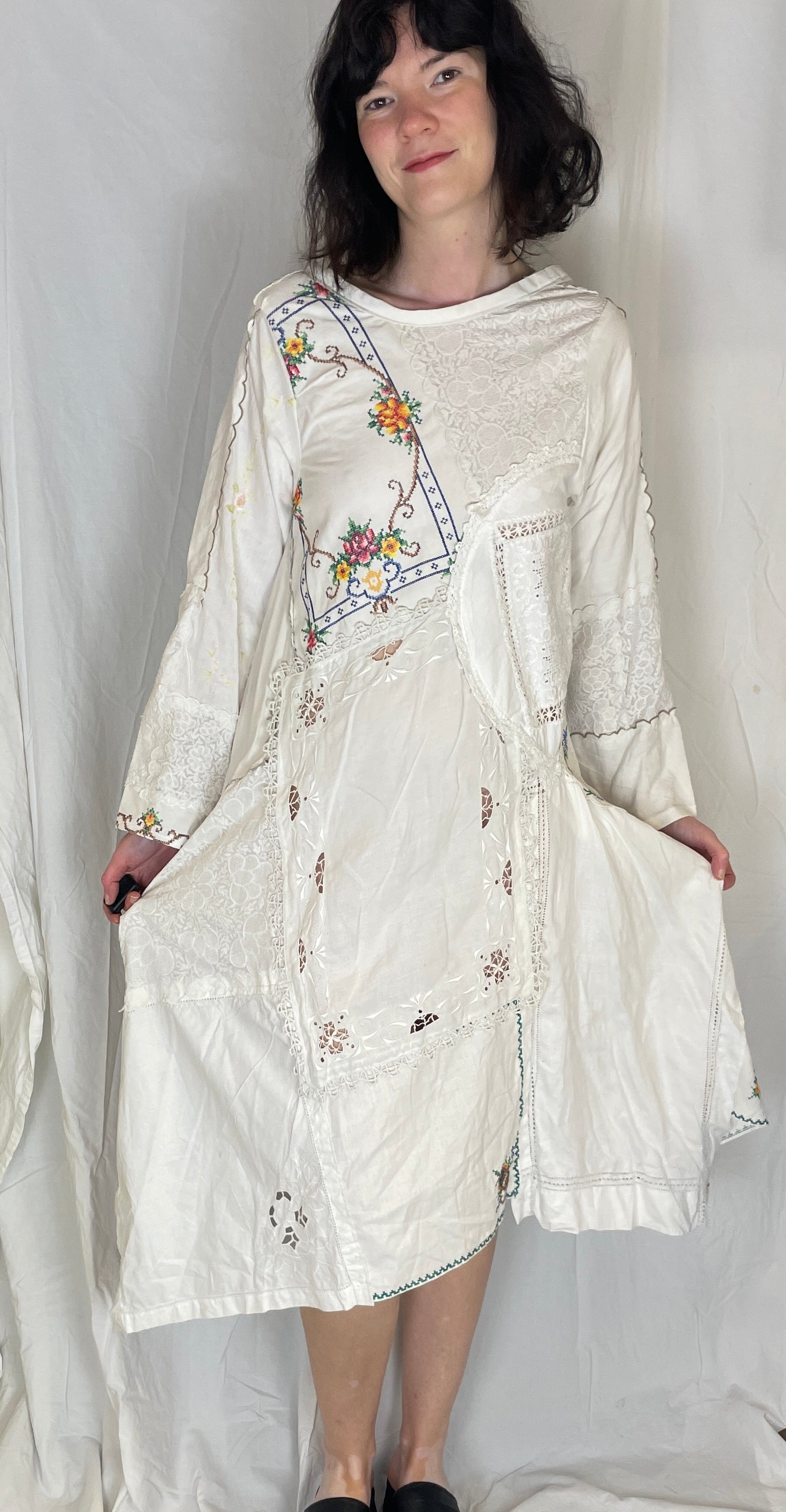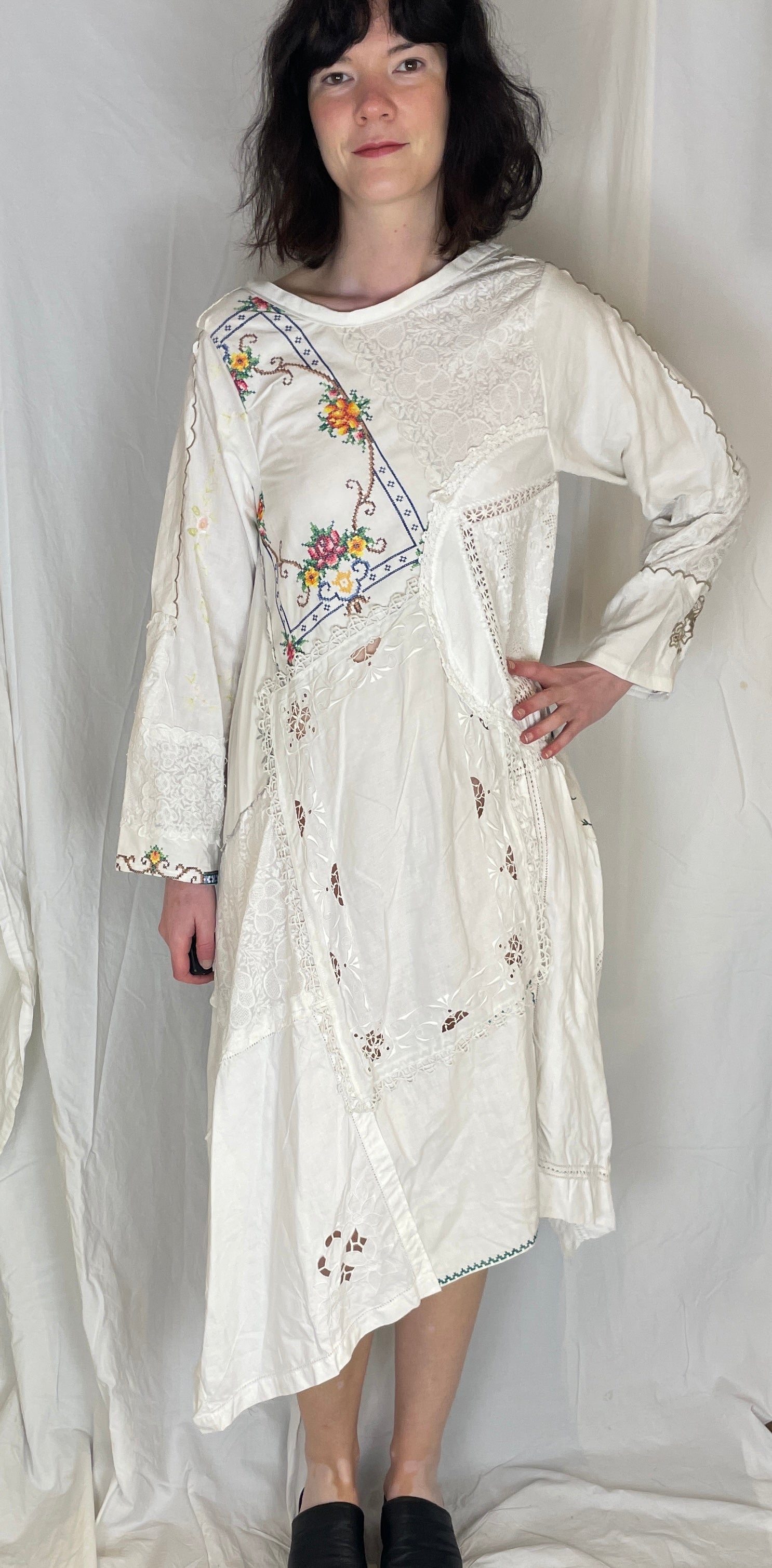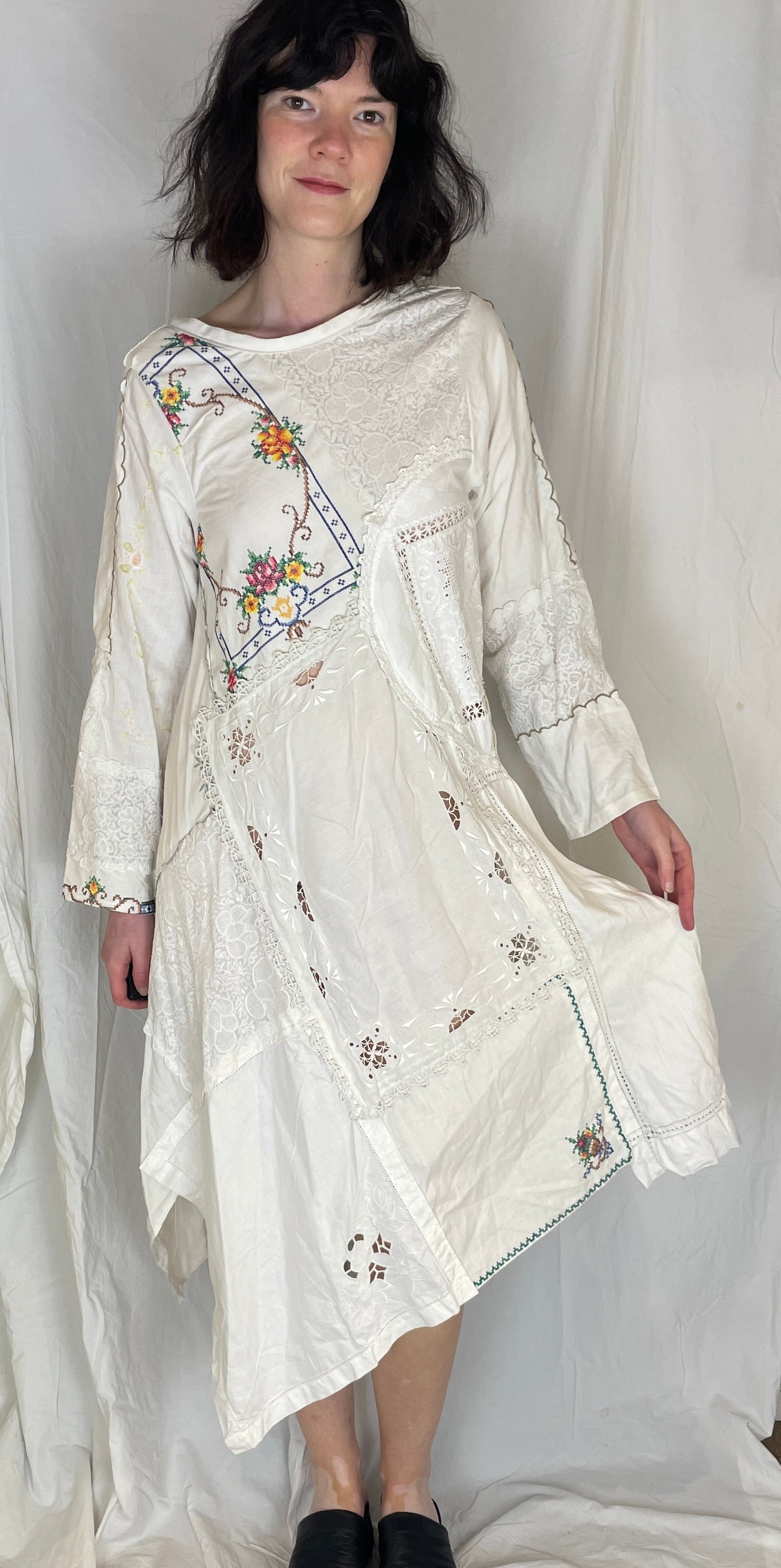 This handmade dress is made from vintage white linen napkins which patchworked together and is one of a kind. Each panel has floral embroidery and lace details. The asymmetric handkerchief hem gives this dress movement and the shape is simple and flattering. The tie back feature on the back gives this dress adjustability and interest.