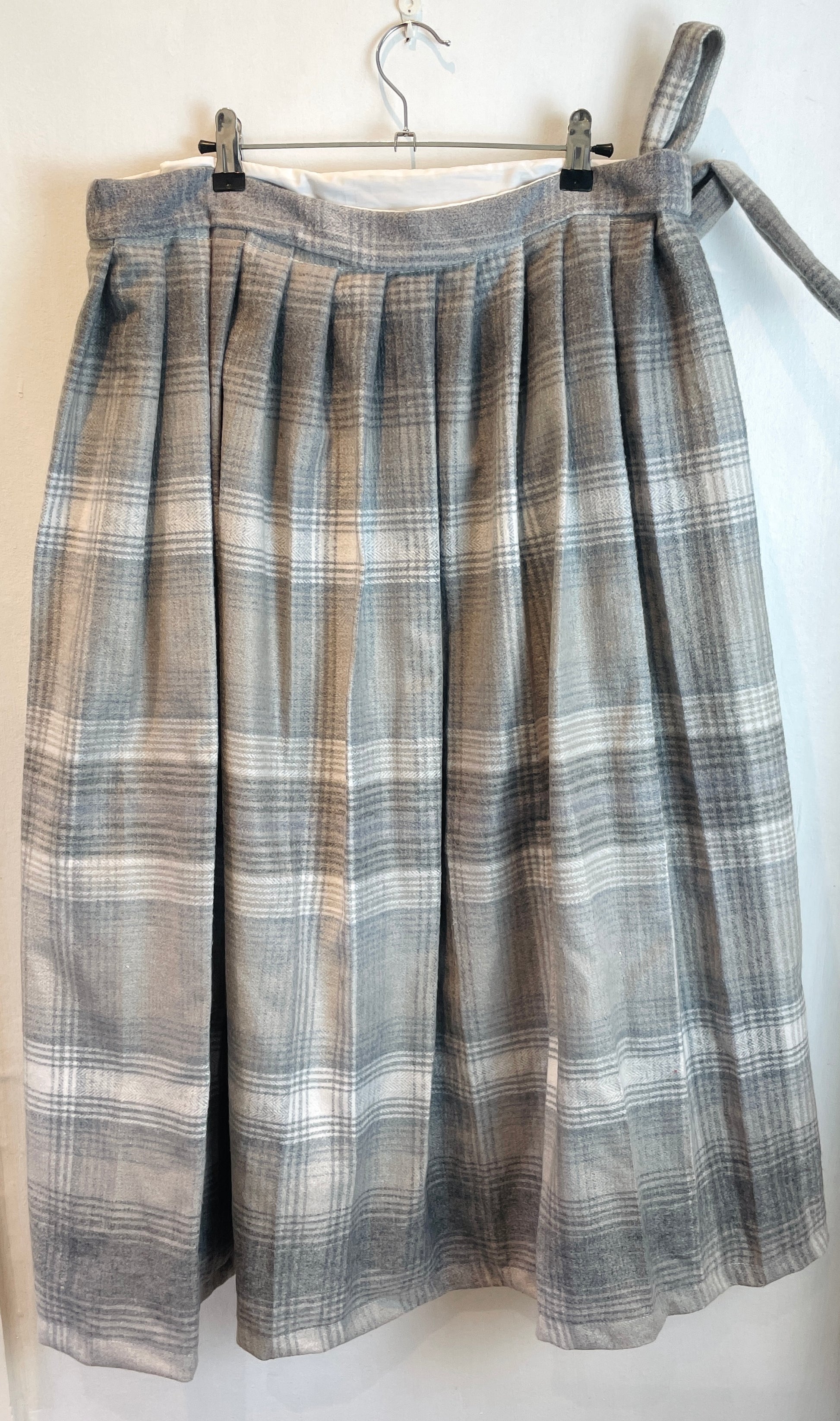This handmade maxi skirt is made from a white and grey checked wool blend fabric with a very soft feel. It has classic pleating for movement and a wrap waist with ties for adjustability. Wear this skirt for everyday wear or layered winter styling.