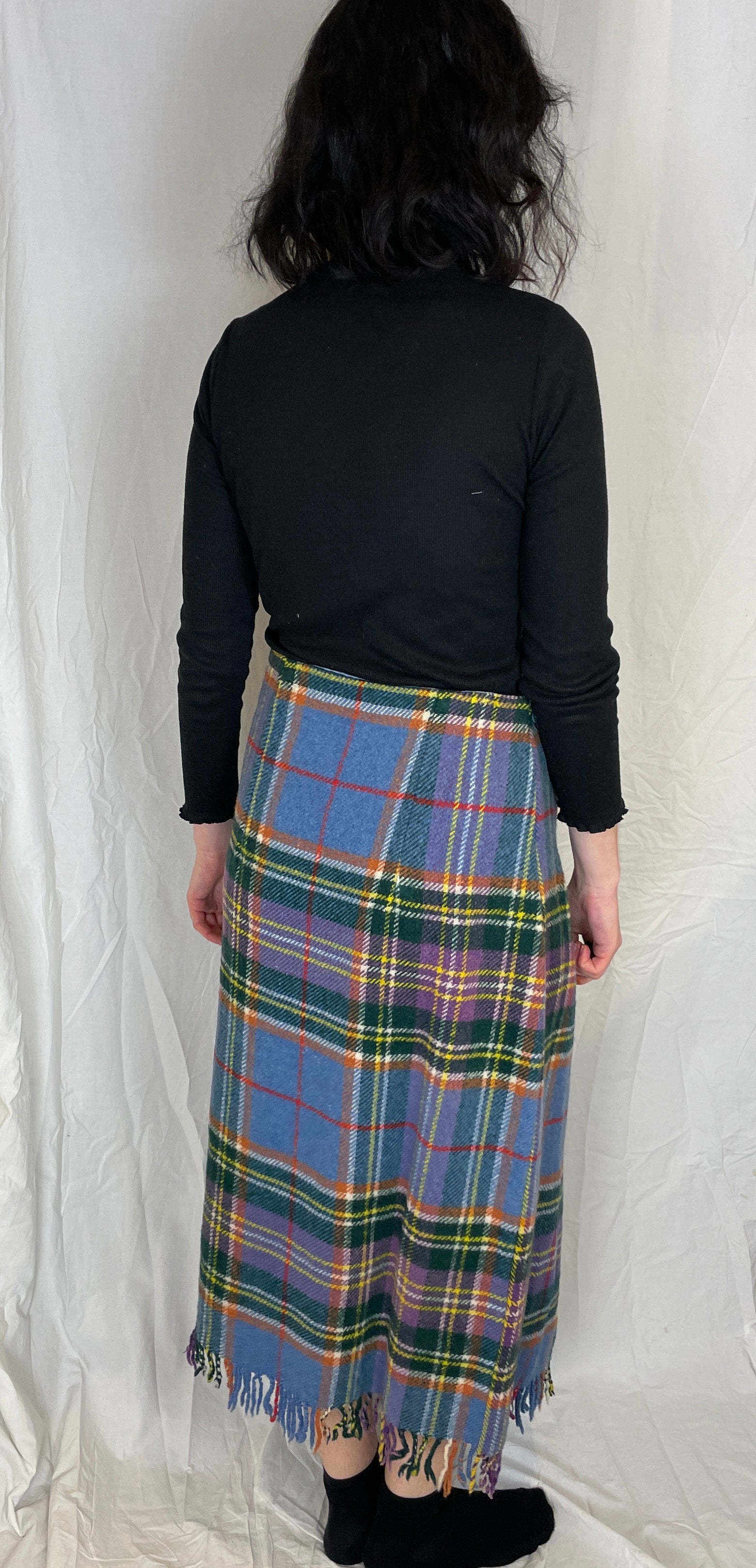 This handmade blue tartan wool asymmetric maxi skirt is a statement piece with a beautiful draped shape. Its made from soft, warm wool in a classic blue check and it features an asymmetric waist and tassel hem for a relaxed and stylish look.