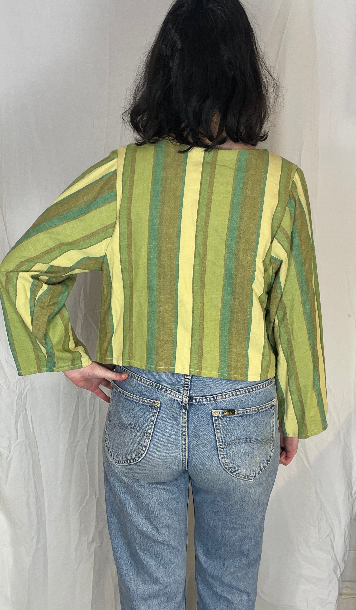 This handmade top is made from vibrant green and yellow striped cotton fabric. This top has a v-neckline and tie front fastening which is adjustable. This top is easy to wear in all seasons and you'll love wearing this bright and comfy top.