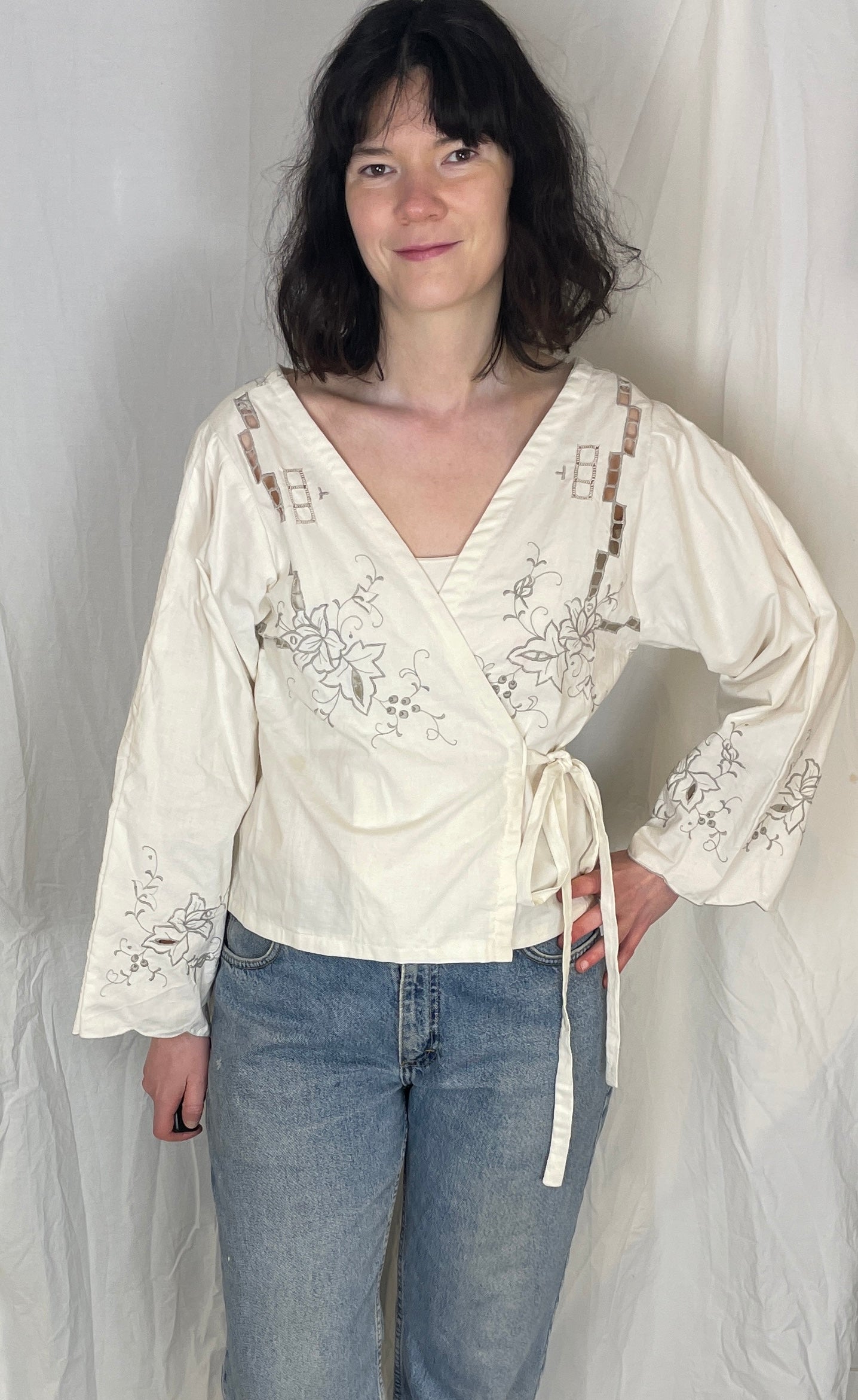 This handmade wrap top is made from a vintage white linen tablecloth to make this one of a kind piece. It has floral embroidery giving it a beautifully detailed look. The wrap design ties at the waist for an adjustable and flattering fit. The linen fabric is soft and has a natural and breathable texture. This top is entirely unique.