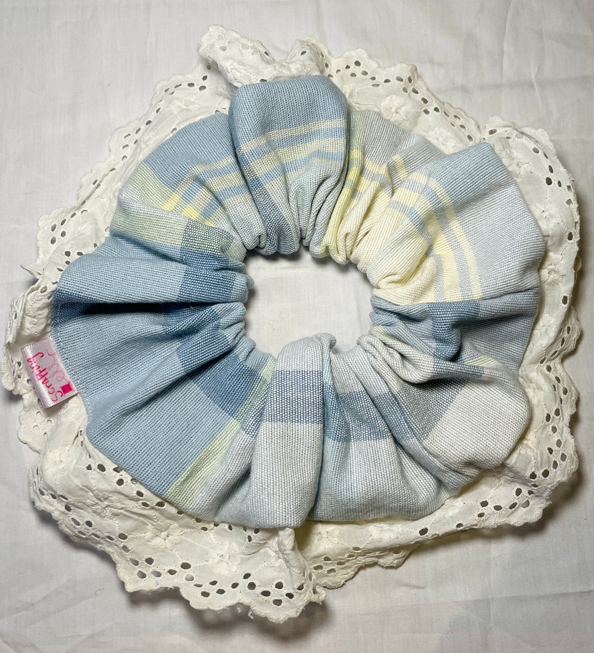 Handmade Blue Check Giant Scrunchie with Broderie Anglais Trim