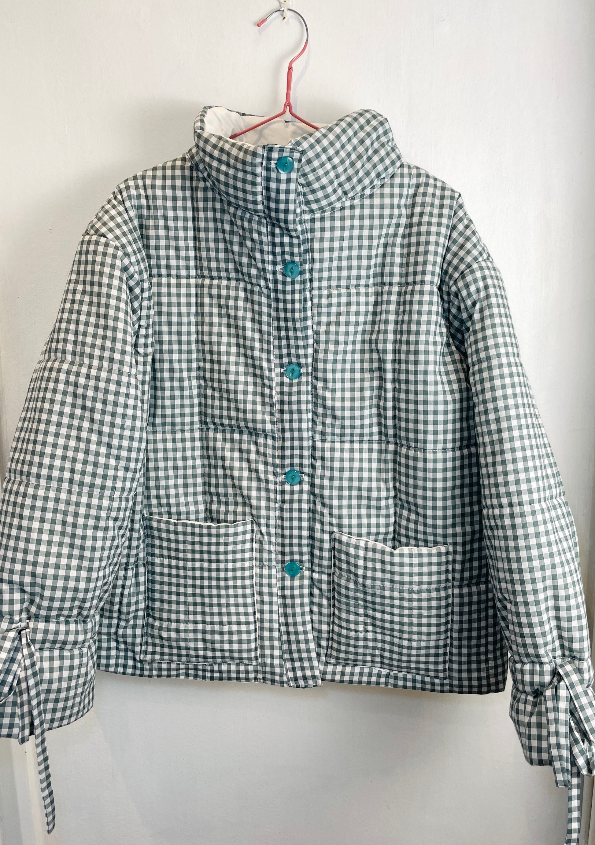 This handmade jacket is made from a green gingham cotton fabric in a quilted padded texture which gives a puffer feel. This jacket is warm but very lightweight. It has a high neckline, drawstring cuffs and a relaxed fit which is very comfortable.