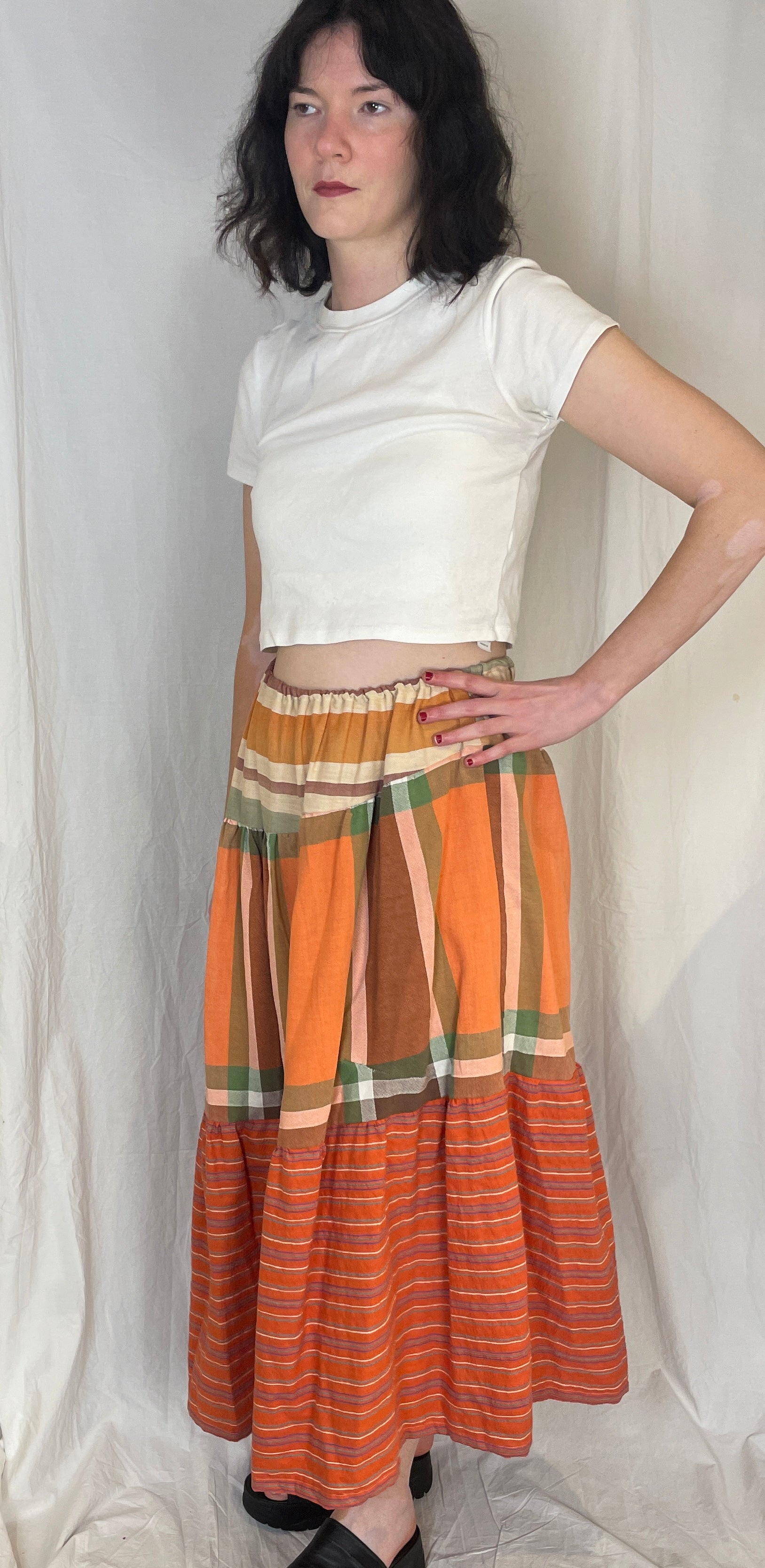 This handmade Kelly maxi skirt is made from a mix of orange cotton check fabrics, with each tier cut from a different pattern for a patchwork effect. The asymmetric hem gives it a flowy and boho look. The elasticated waist makes this skirt very comfortable and it is a unique, one of a kind piece.