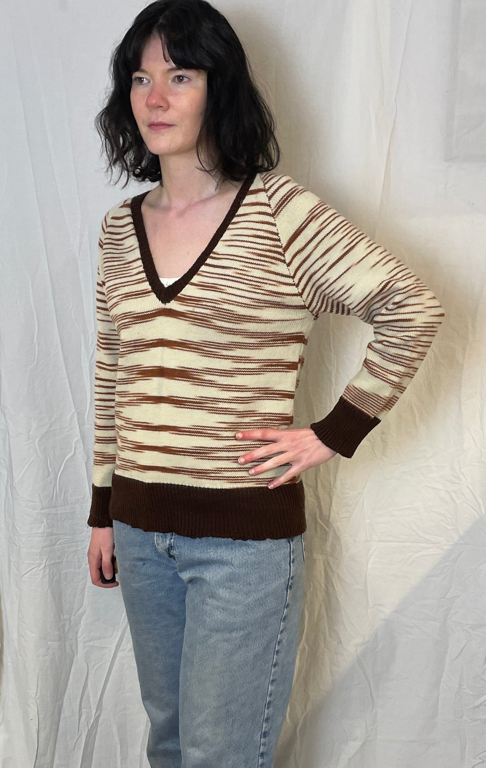 This vintage 1970s handknit jumper is made from wool in cream and brown colours with abstract horizontal stripes. This jumper features a v-neckline and ribbed trims which gives it a casual look. The handknit adds texture and it is a perfect everyday vintage piece.