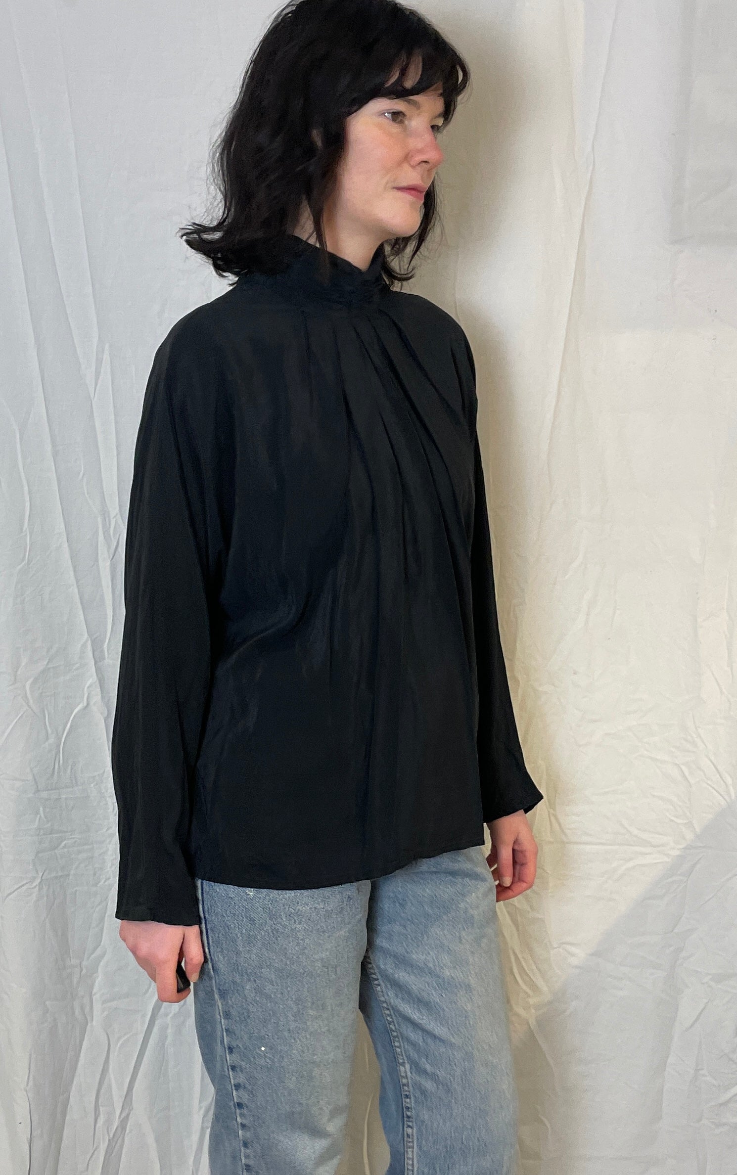 This vintage 1980s Aquascutum blouse is very beautifully made from soft, fluid black silk fabric. This blouse has a high neck with gathers that flow into a loose, trapeze shape. It is elegant, minimal, and very sophisticated and is perfect for both day and evening wear.