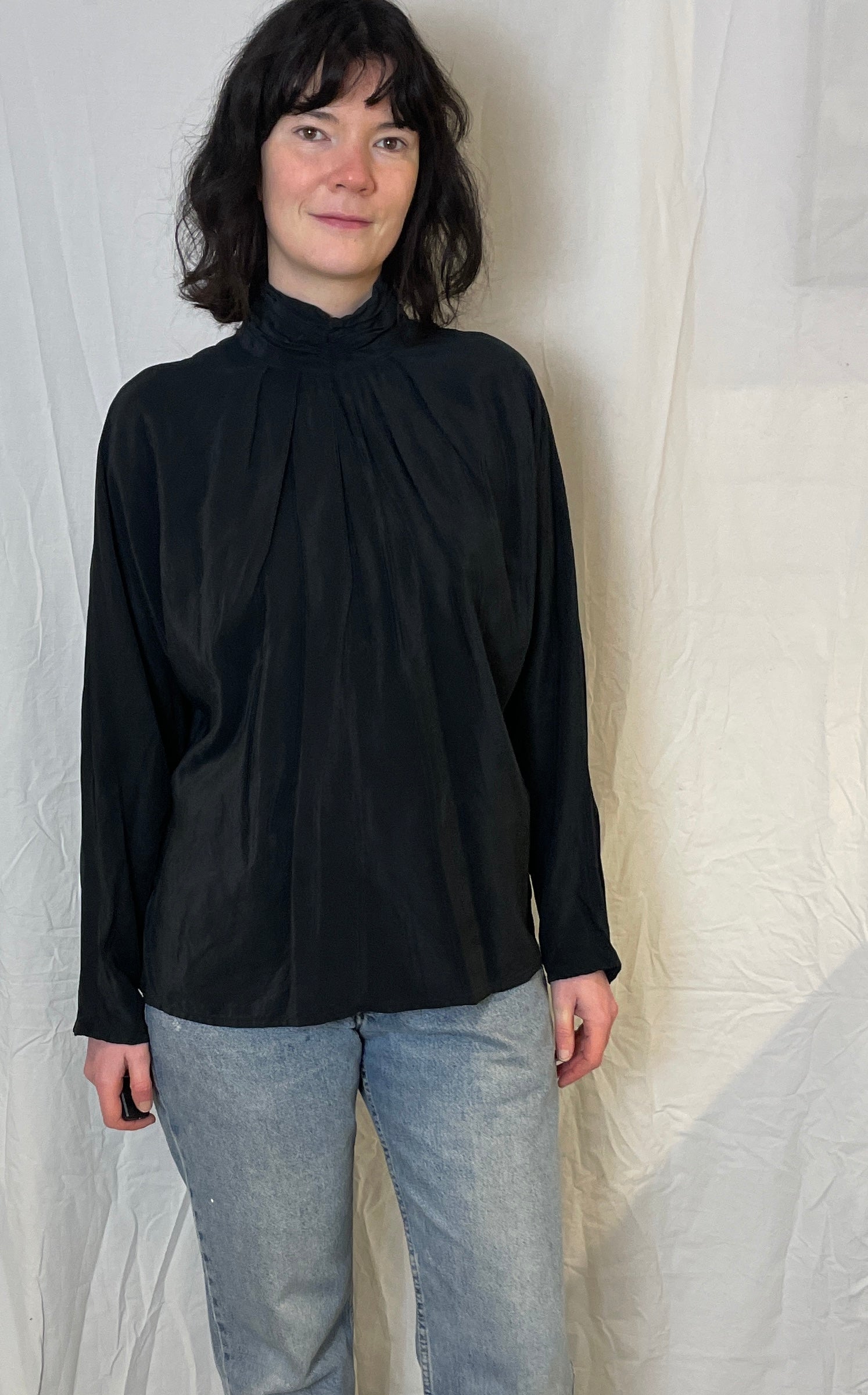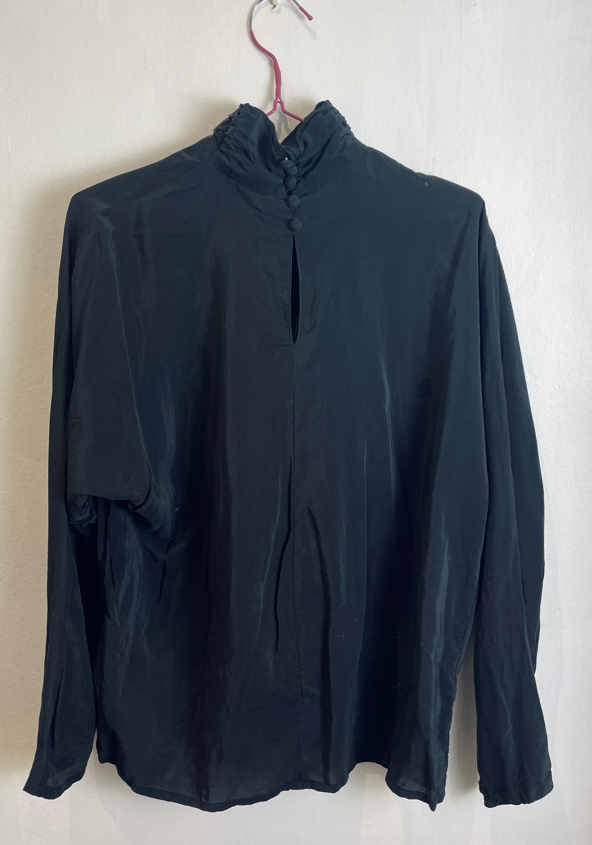 Vintage 80s Aquascutum Black Silk High Neck Trapeze Blouse - Up To Size 12