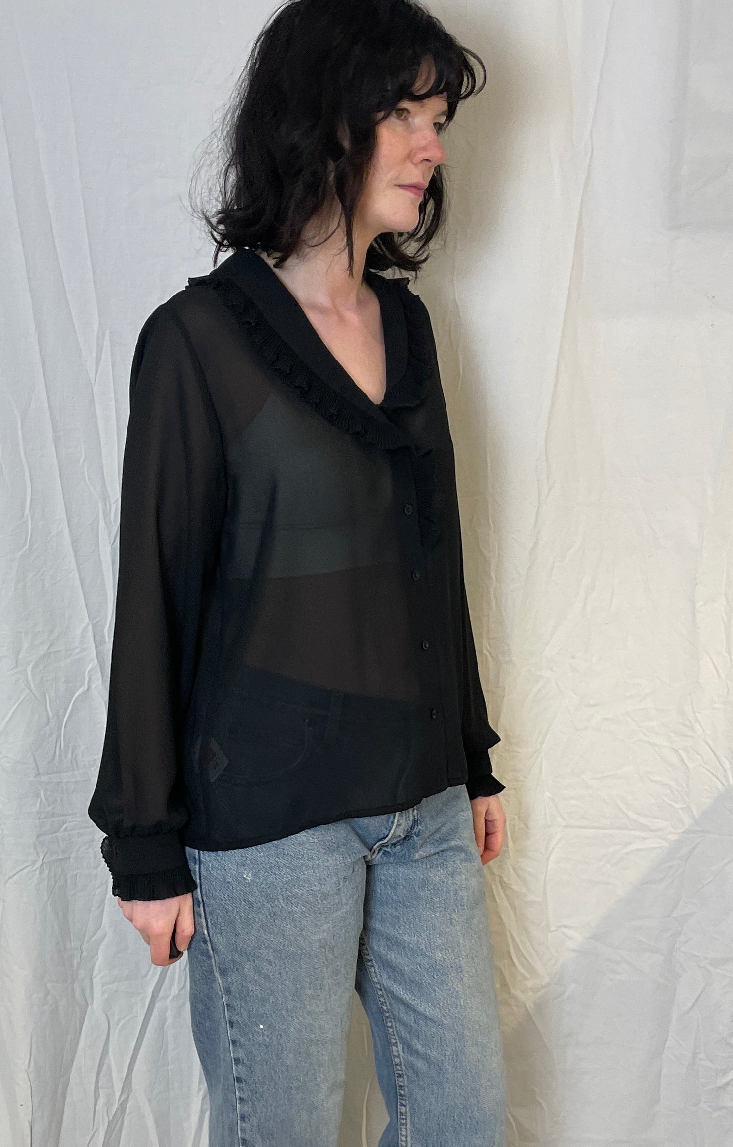 This vintage 1980s blouse is made from beautiful lightweight sheer black chiffon which is very soft. It has a v-neckline with a delicate frilled edge and a shawl collar giving it a romantic look. This blouse has button fastenings down the front and is perfect for dressing up or down.