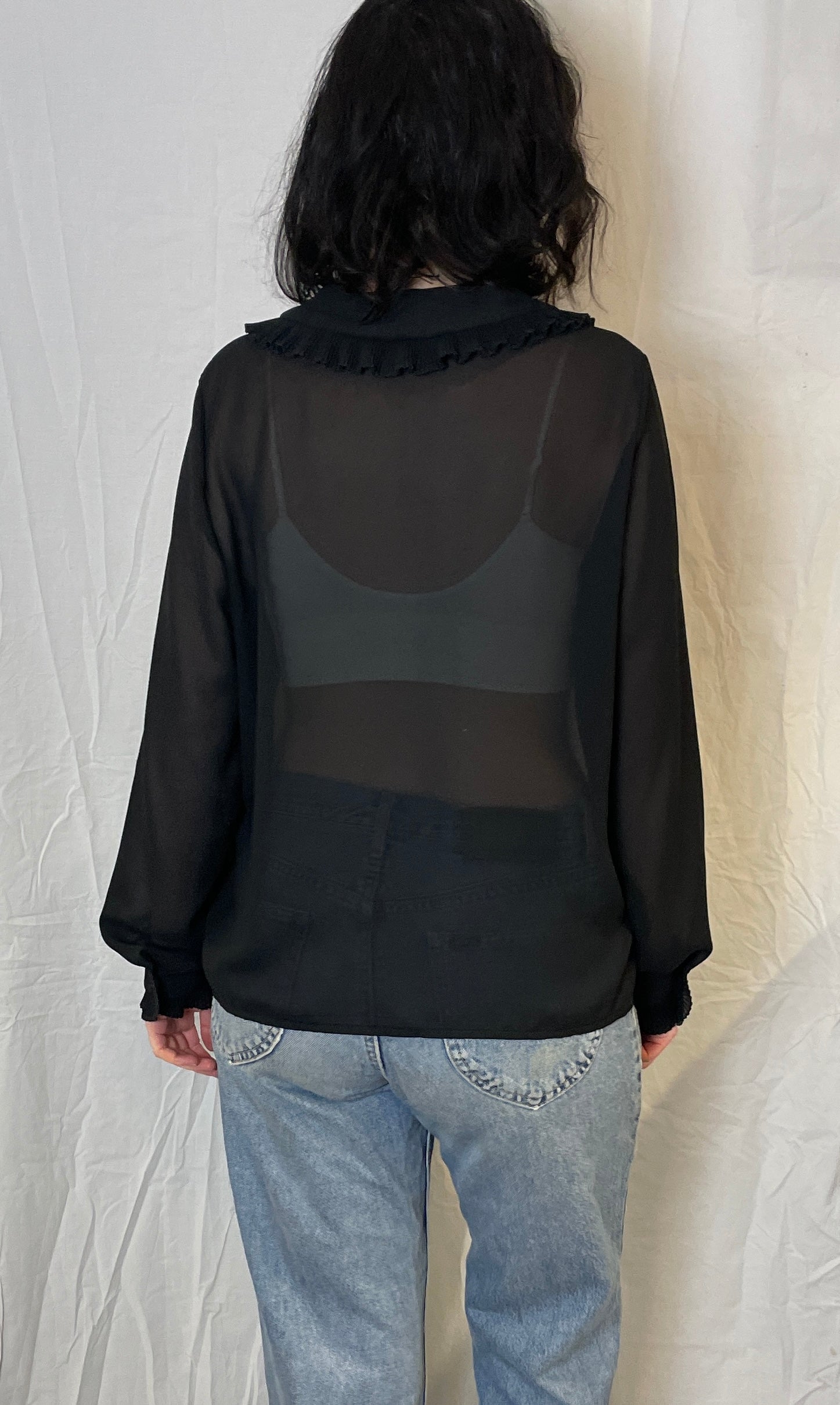 Vintage 80s Black Sheer Chiffon Ruffle Neckline Blouse - Up To Size 14