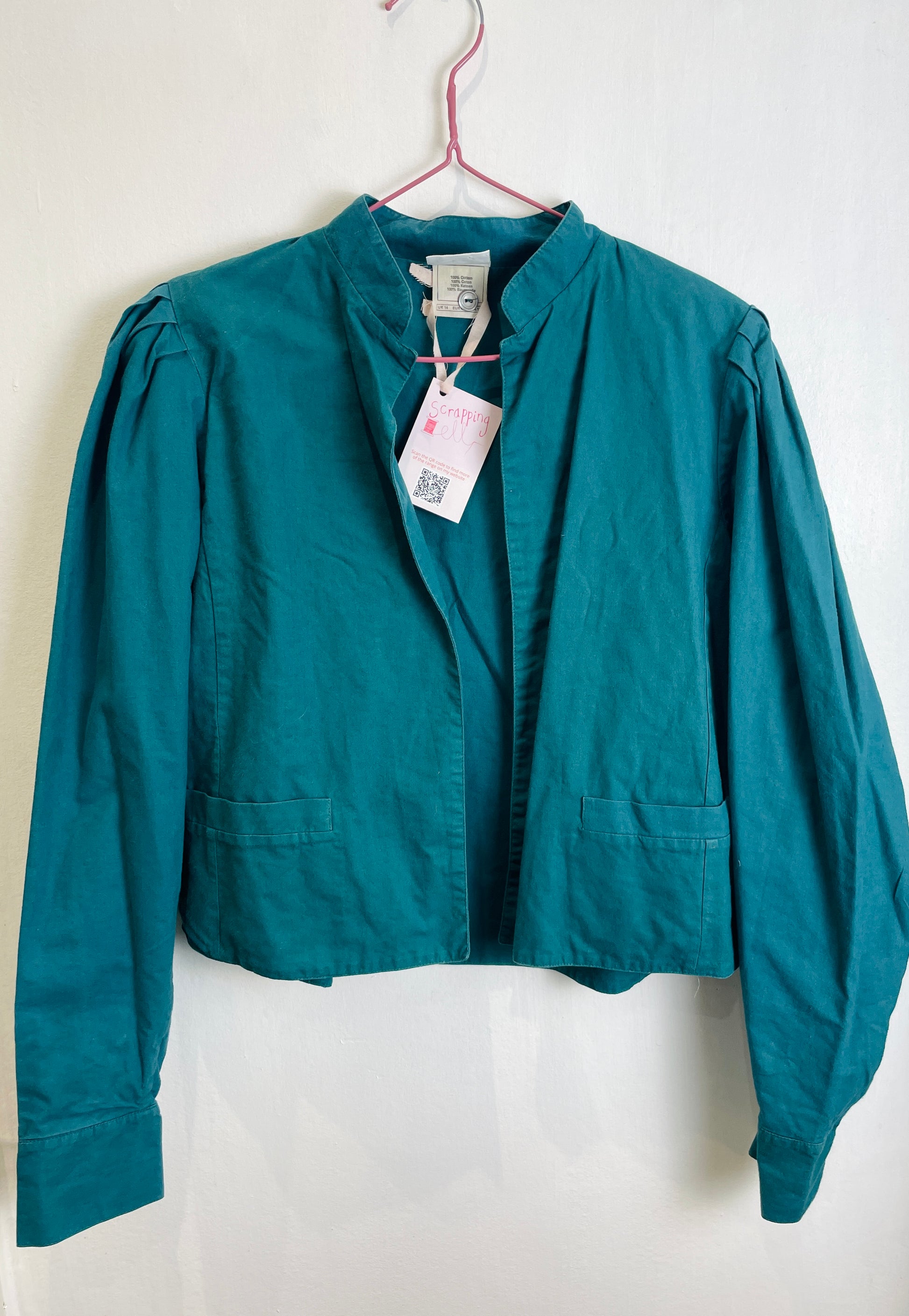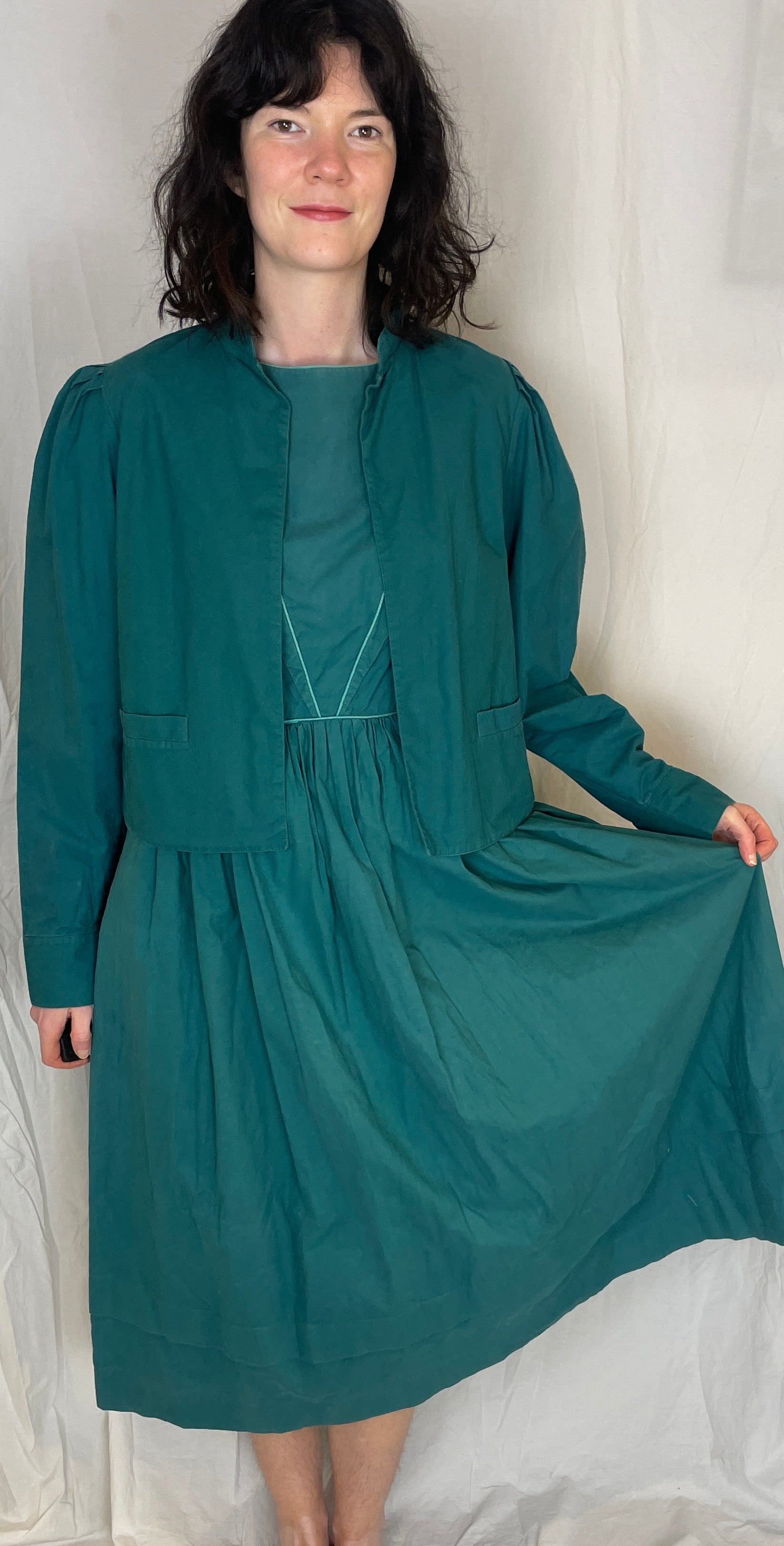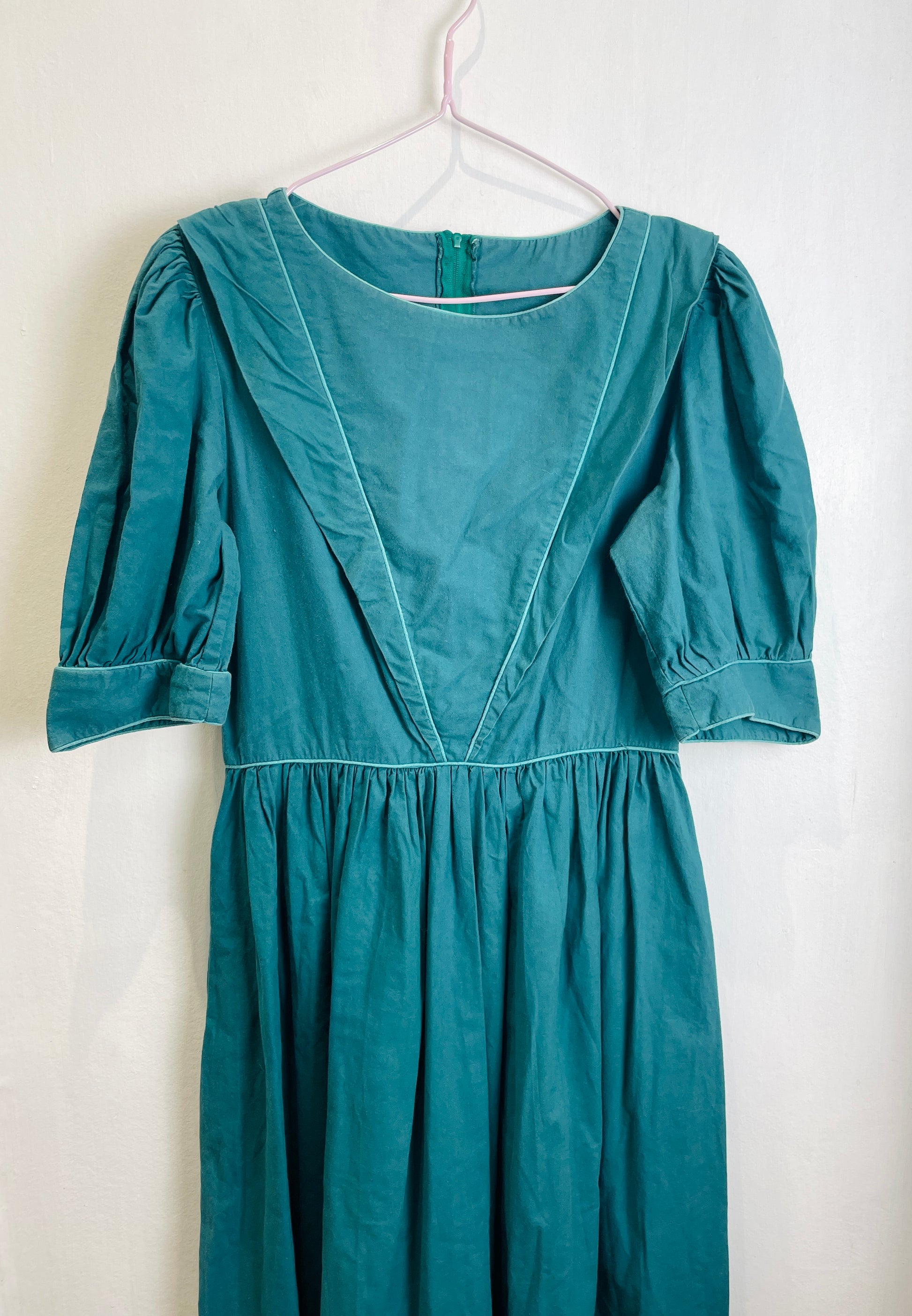 This vintage 1980s Laura Ashley dress is made from thick cotton fabric in a deep turquoise green. This midi length dress has a gathered waist and short puff sleeves and has a feminine silhouette. It comes with a matching jacket, making it perfect for smart occasions or vintage style outfit.