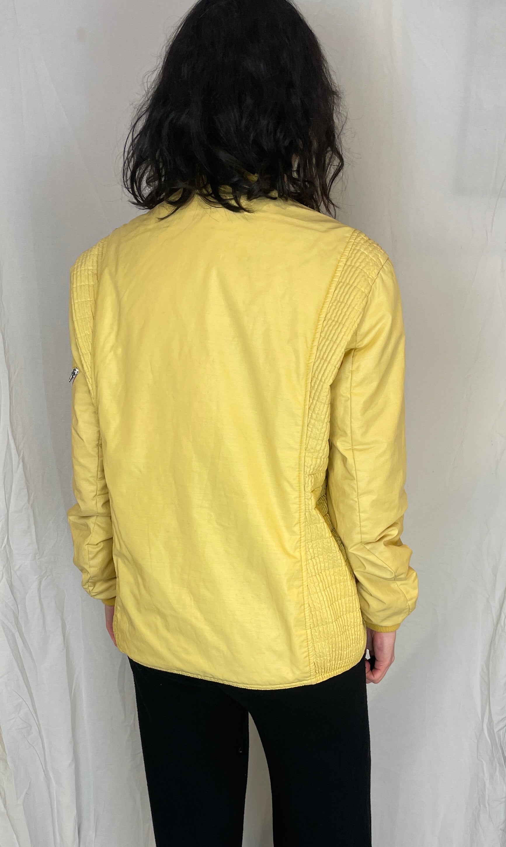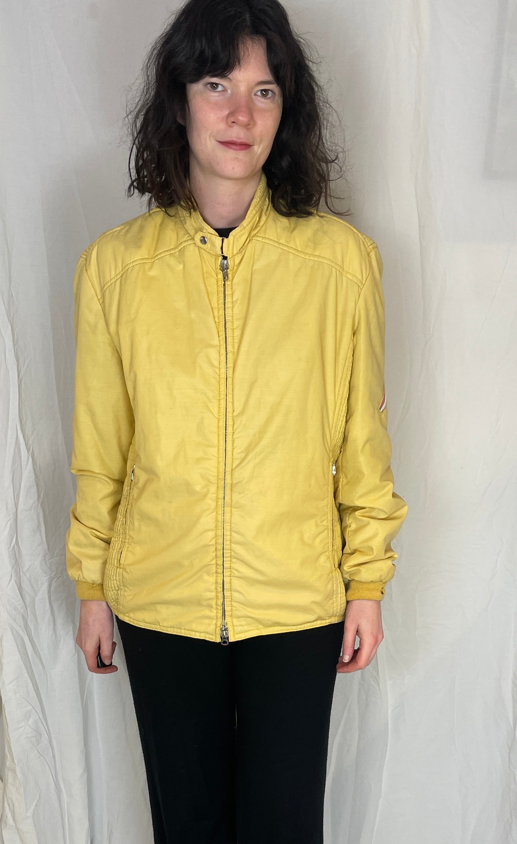 This vintage 80s ski bomber jacket is made from pale yellow windproof nylon and has a classic sporty shape. This jacket has ribbed cuffs, collar and a zip front that gives it that retro ski look. It is relaxed and lightweight, great for layering and everyday outfits.