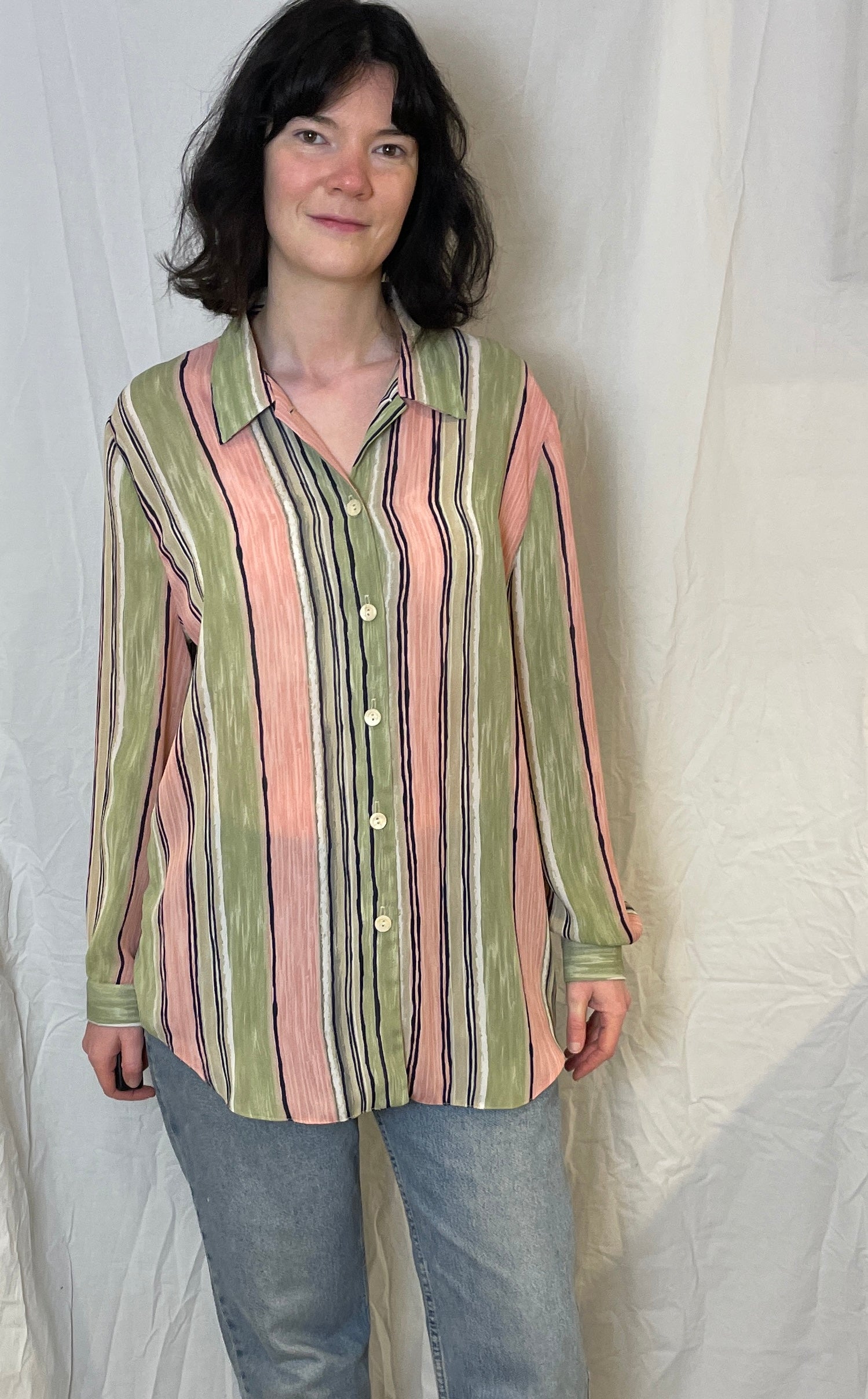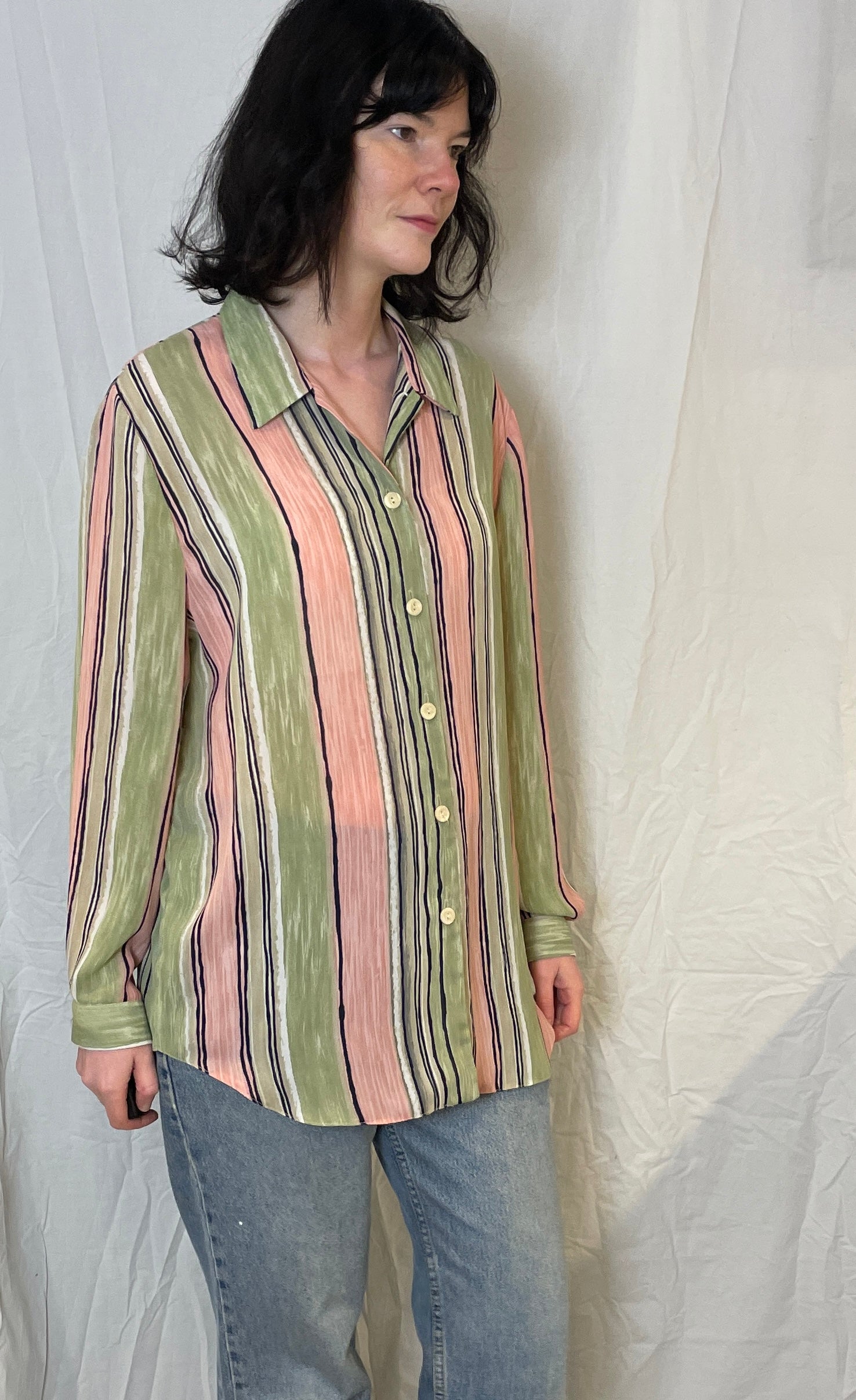 Vintage 80s Pink and Green Striped Chiffon Shirt - Up To Size 14