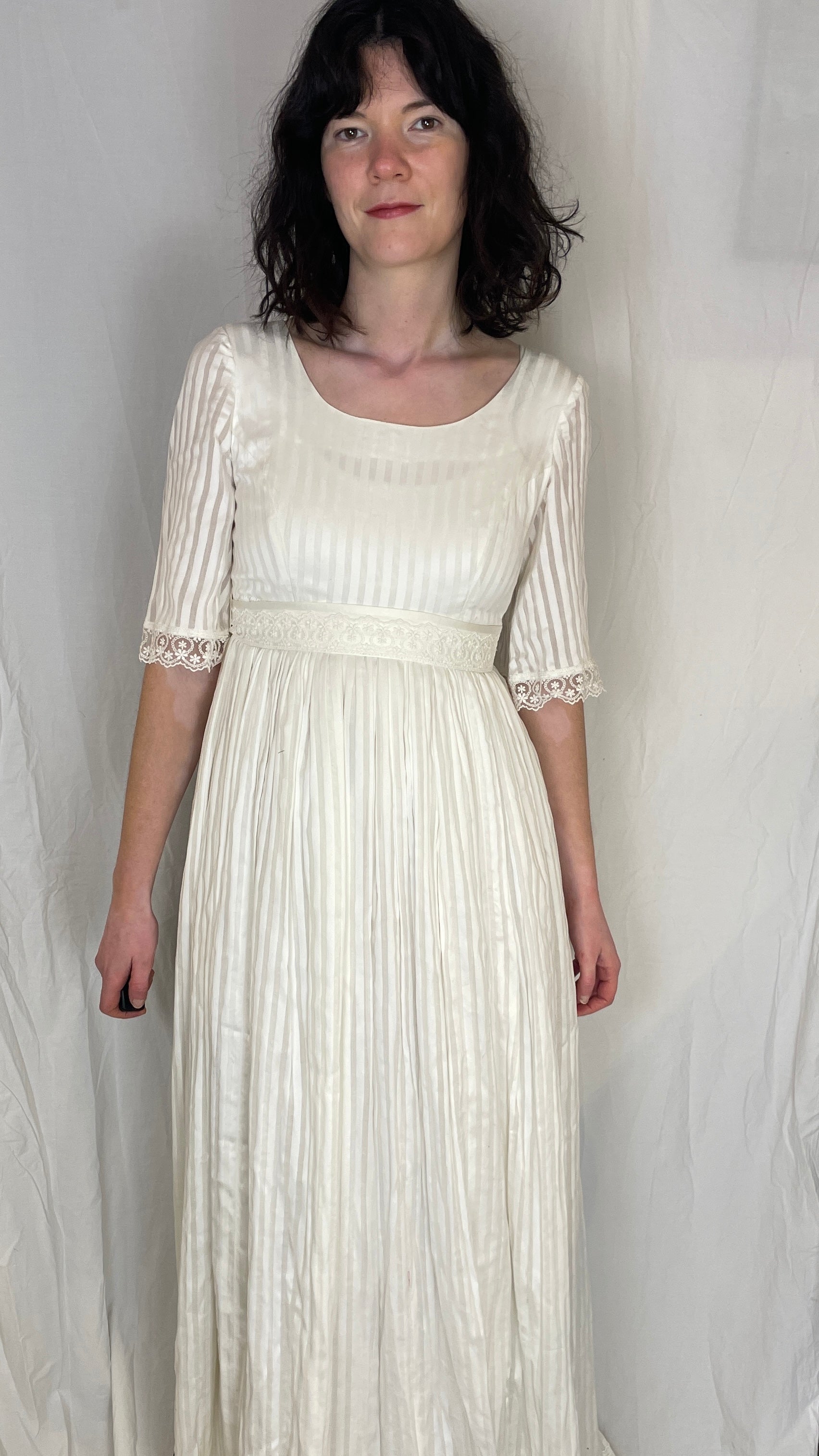 This vintage 80s maxi dress is made from a white fabric with a subtle stripe texture.