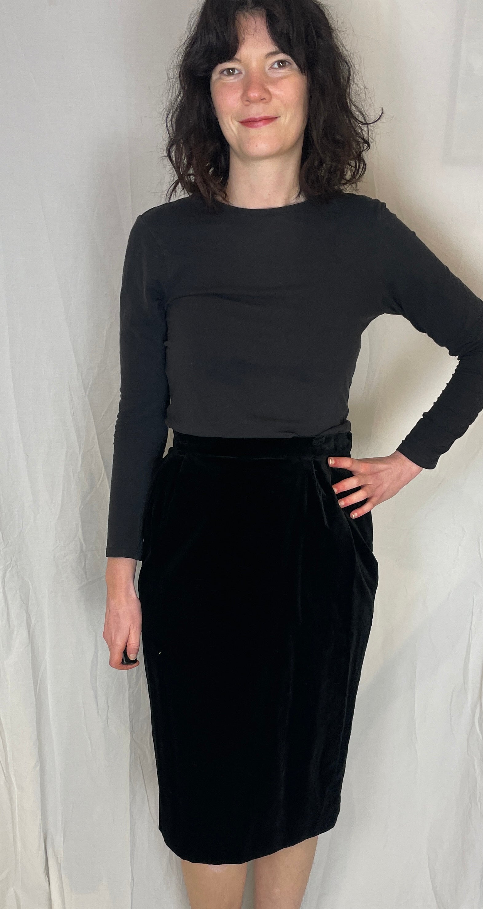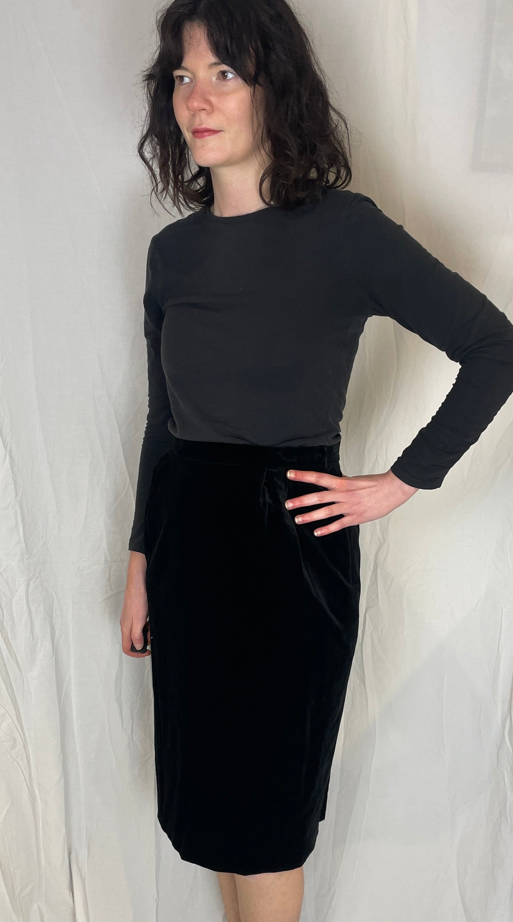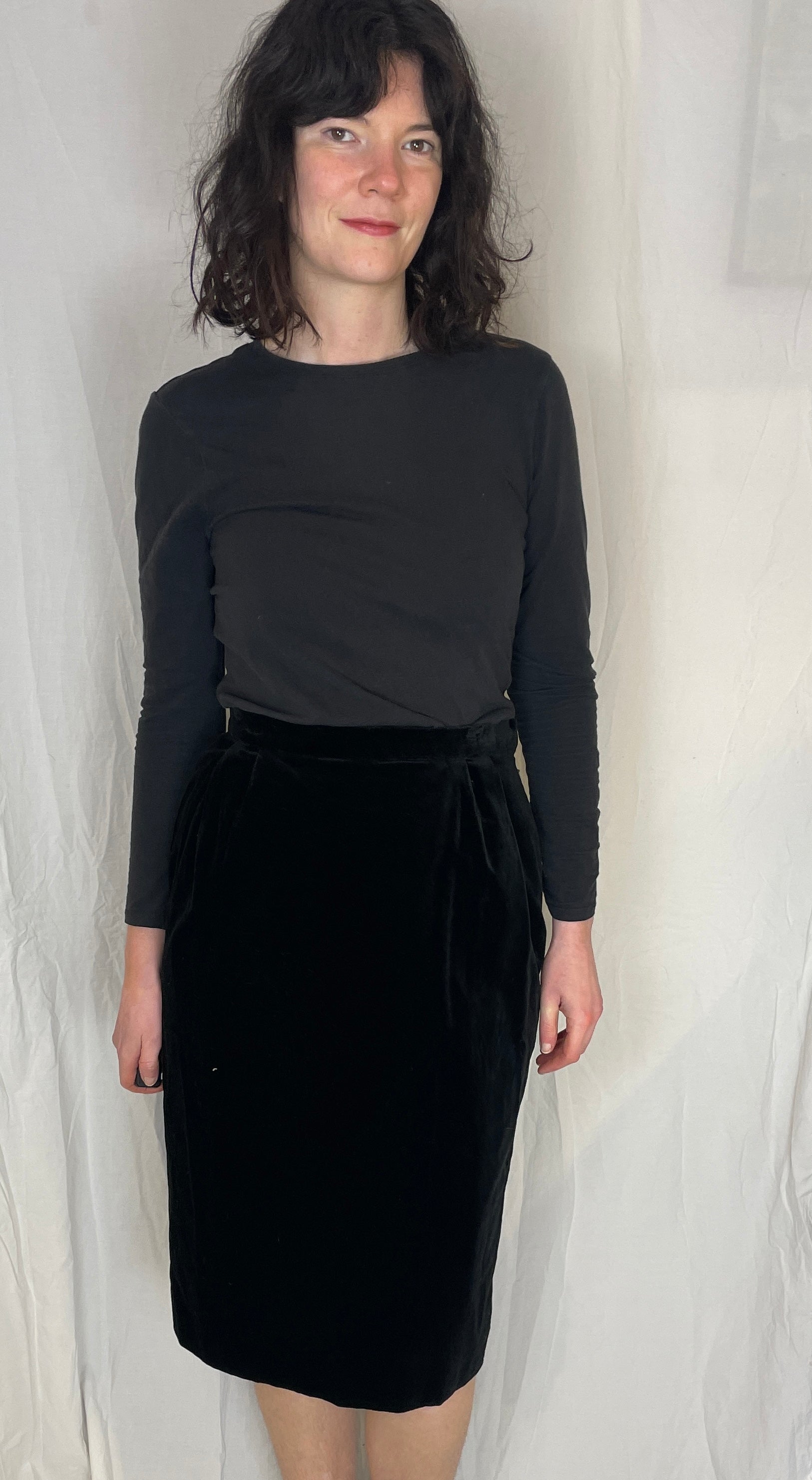This vintage 90s midi skirt is made from very soft black cotton velvet. It has a flattering pleat front design that adds shape and has a minimal silhouette. This skirt has a waistband in a timeless midi length which makes it easy for everyday, office or evening outfits.