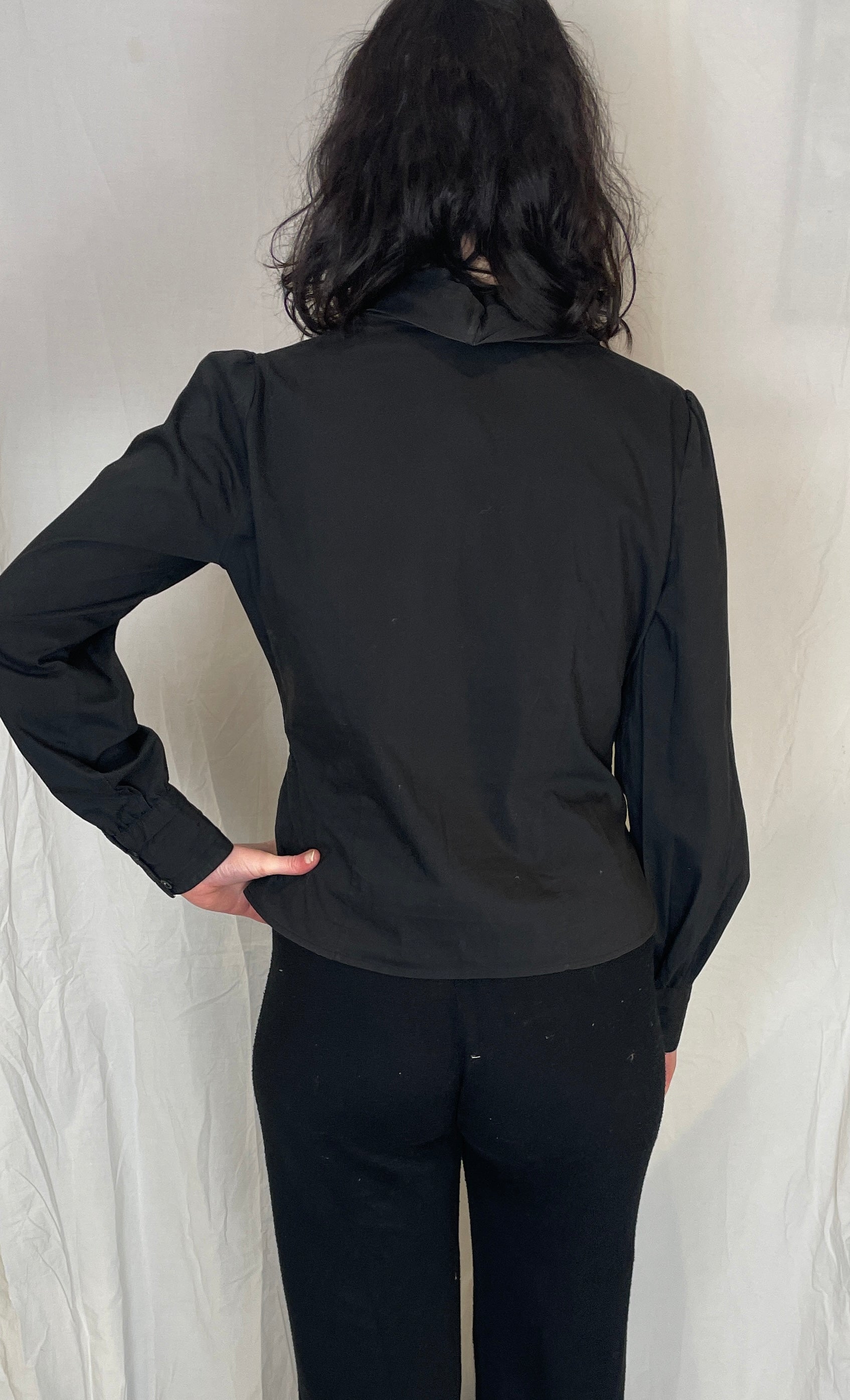 This vintage 1990s blouse is made from black cotton fabric with pleating at the waist and collar for a unique shape. It has a matching diamante belt to cinch the waist which adds something a bit different to this black blouse. It is perfect for evening events or to dress up a casual outfit.