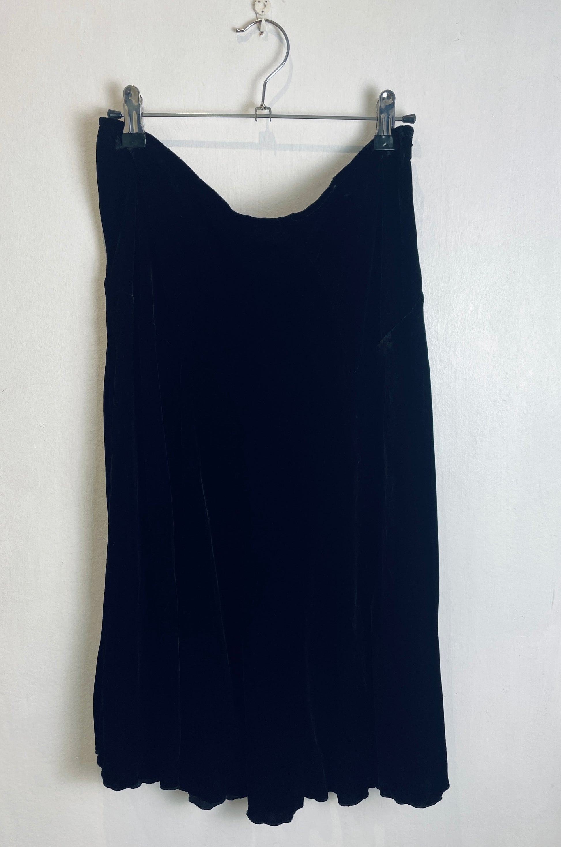 This vintage 90s skirt is made from soft black silk velvet, cut into panels that give it a flowing drape. This skirt is midi length and can be dressed up for evenings or styled casually with knitwear for an everyday look.