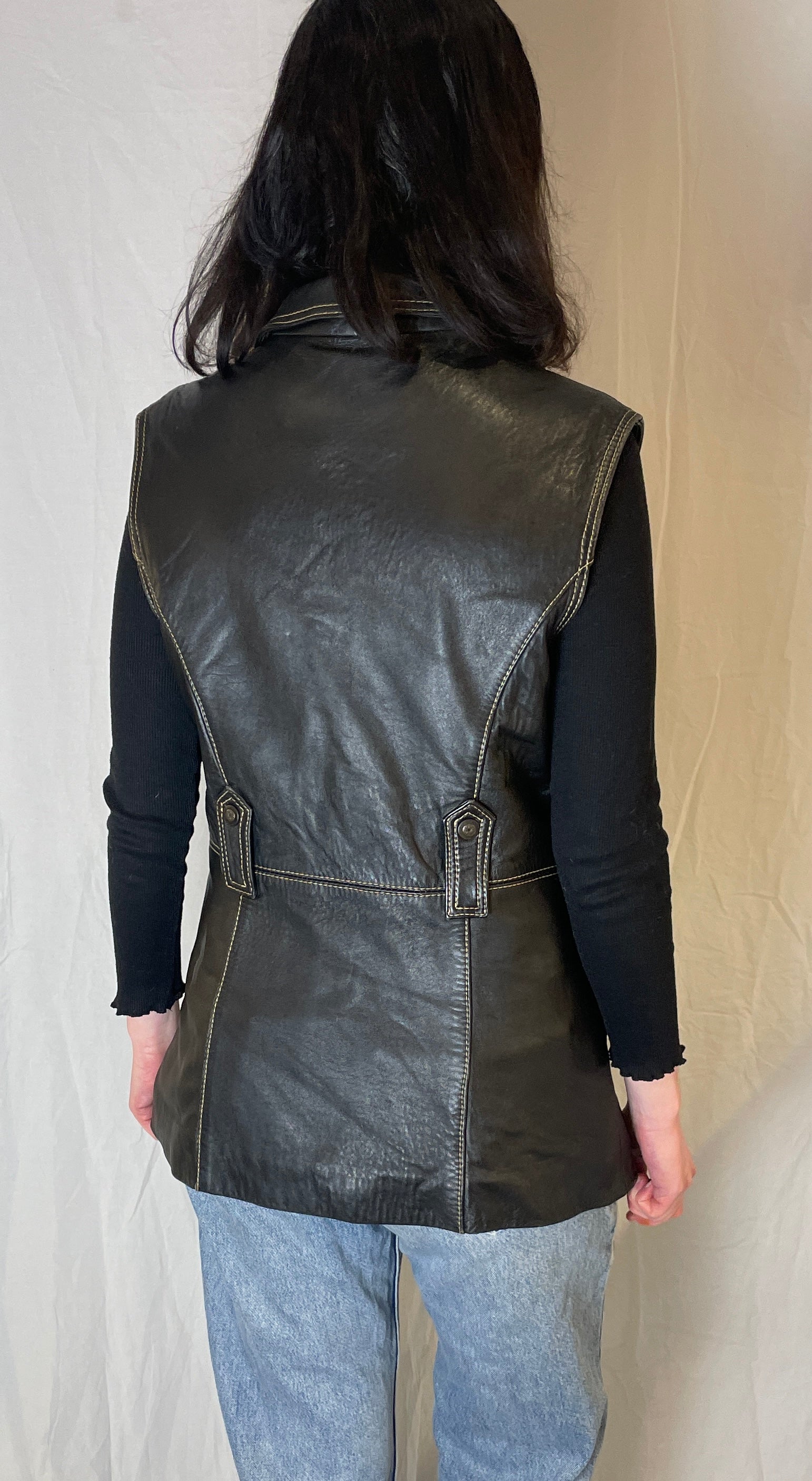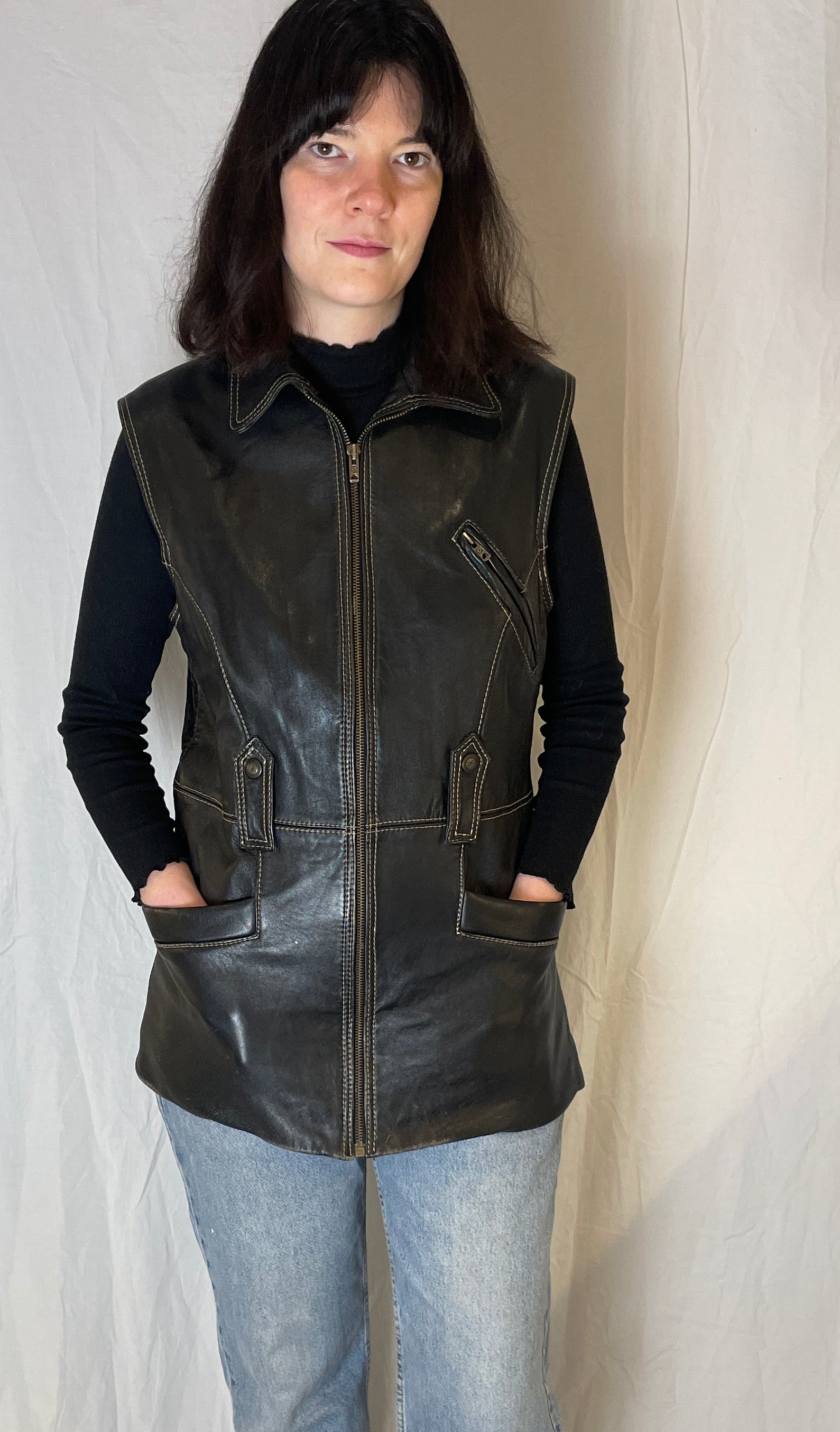 This vintage 90s leather jacket is a classic black colour in real leather fabric with contrast stitching. The long length and sleeveless design gives it a strong utility feel. It has a button up front, practical pockets and stitched detailing. Wear this piece layered over a knitted jumper for an effortless look.