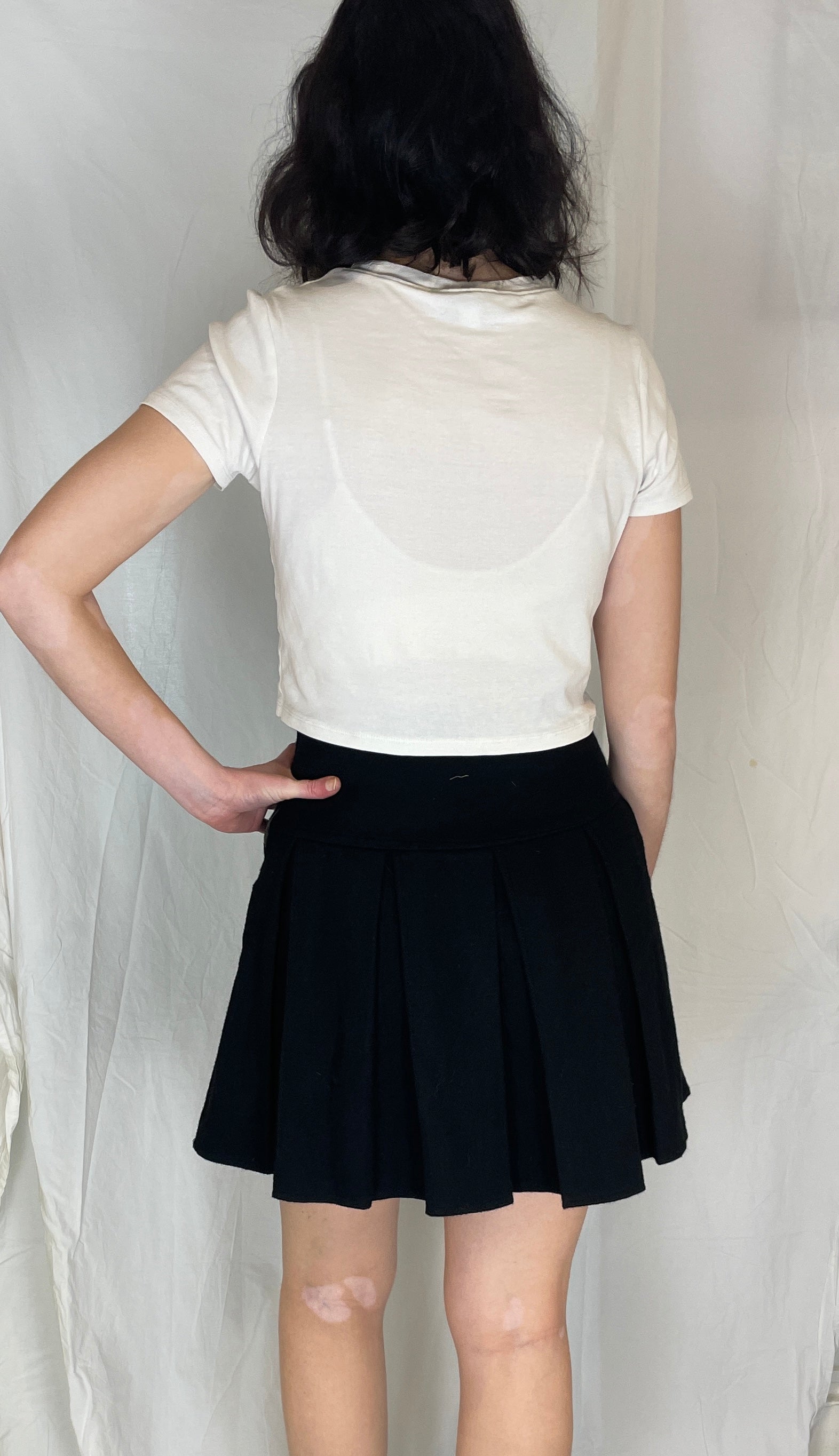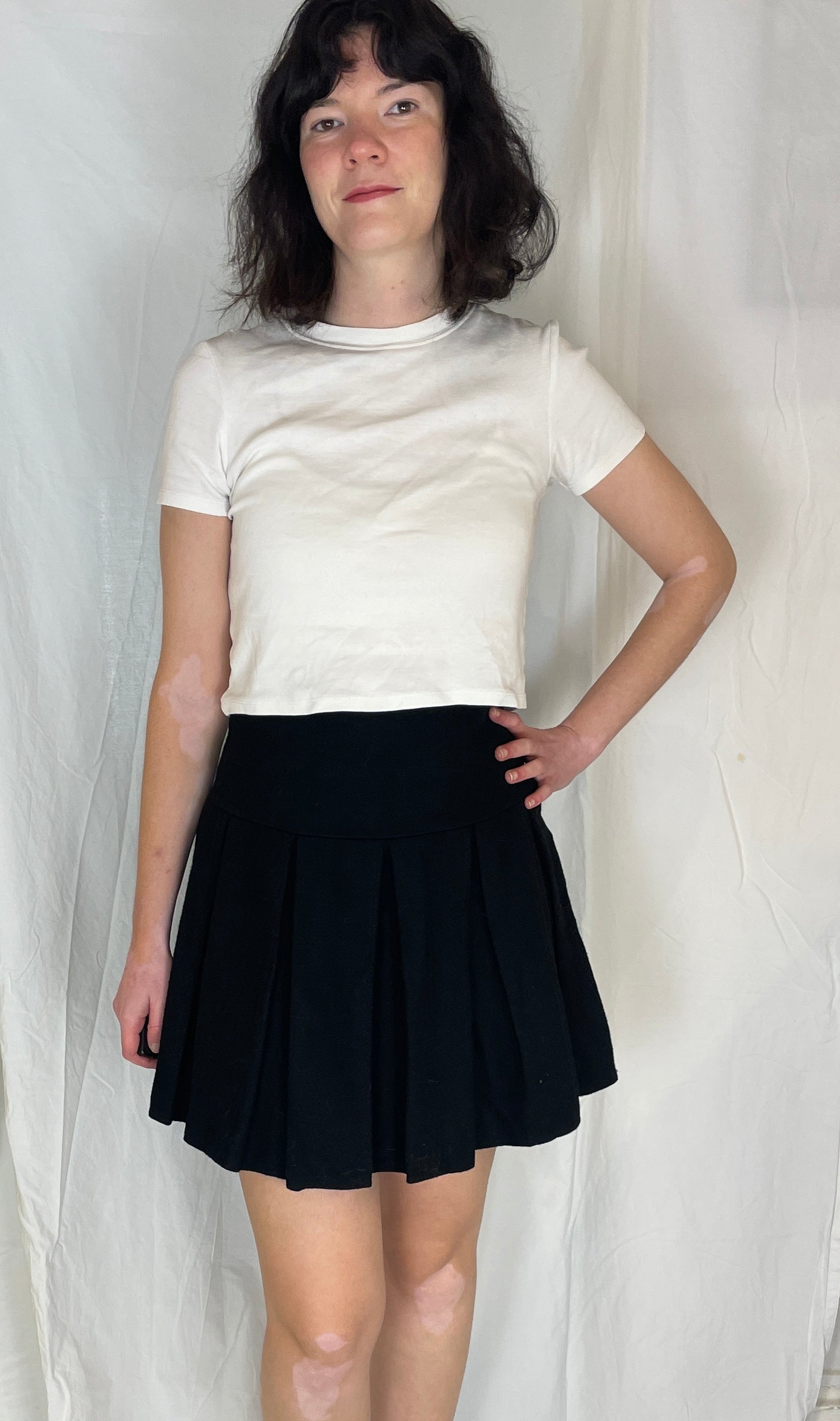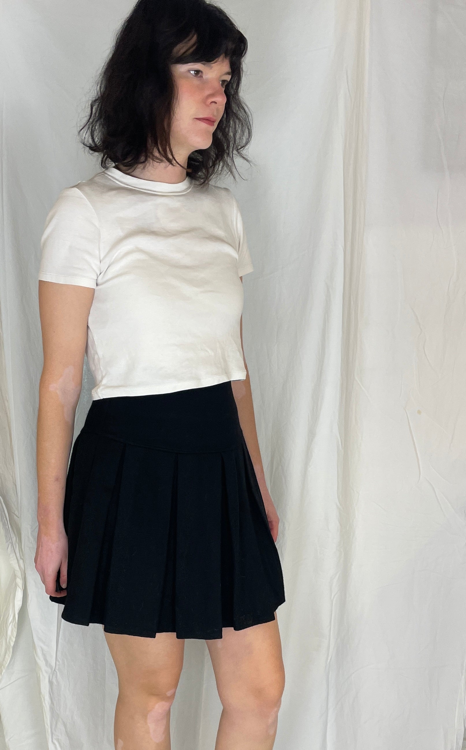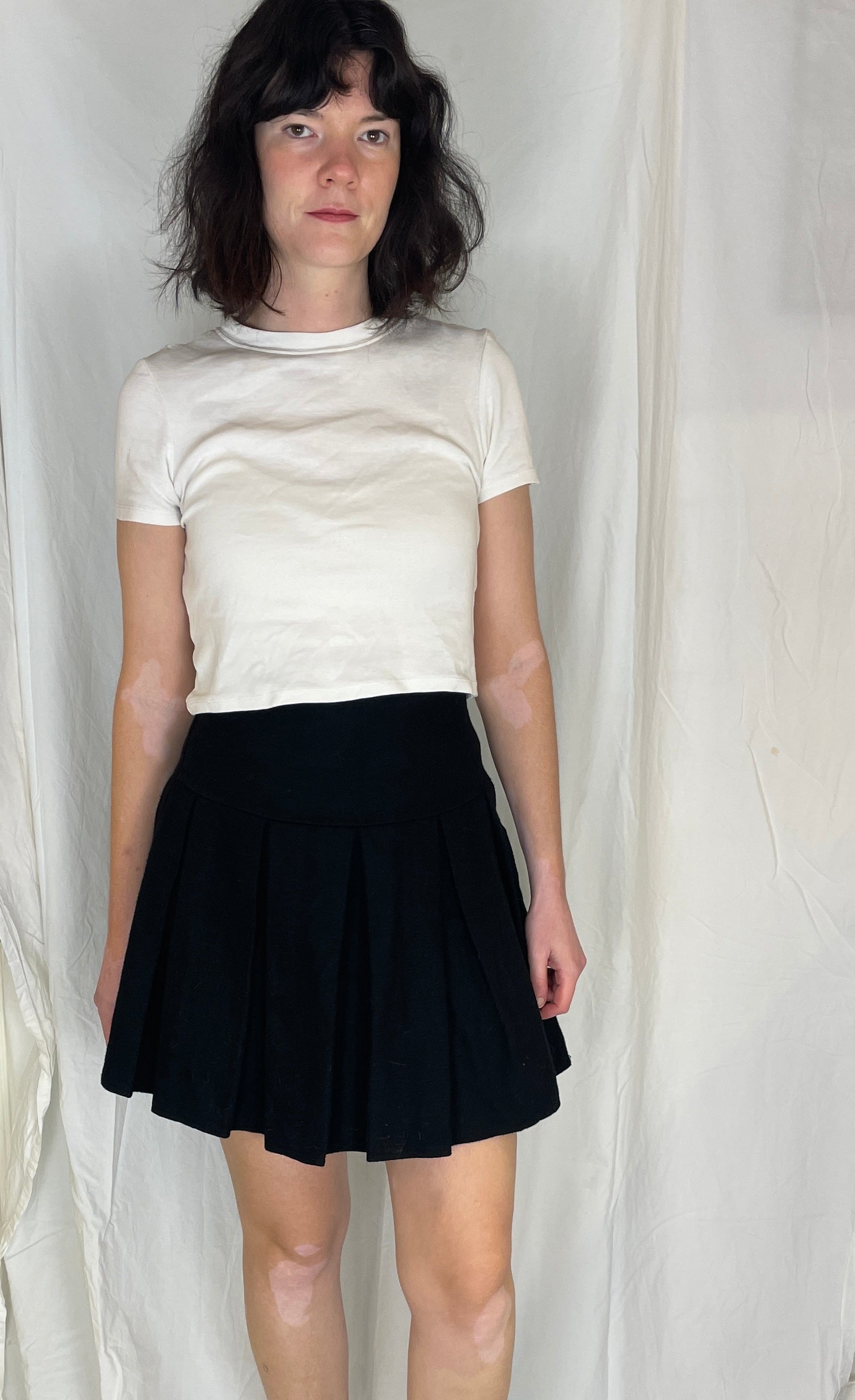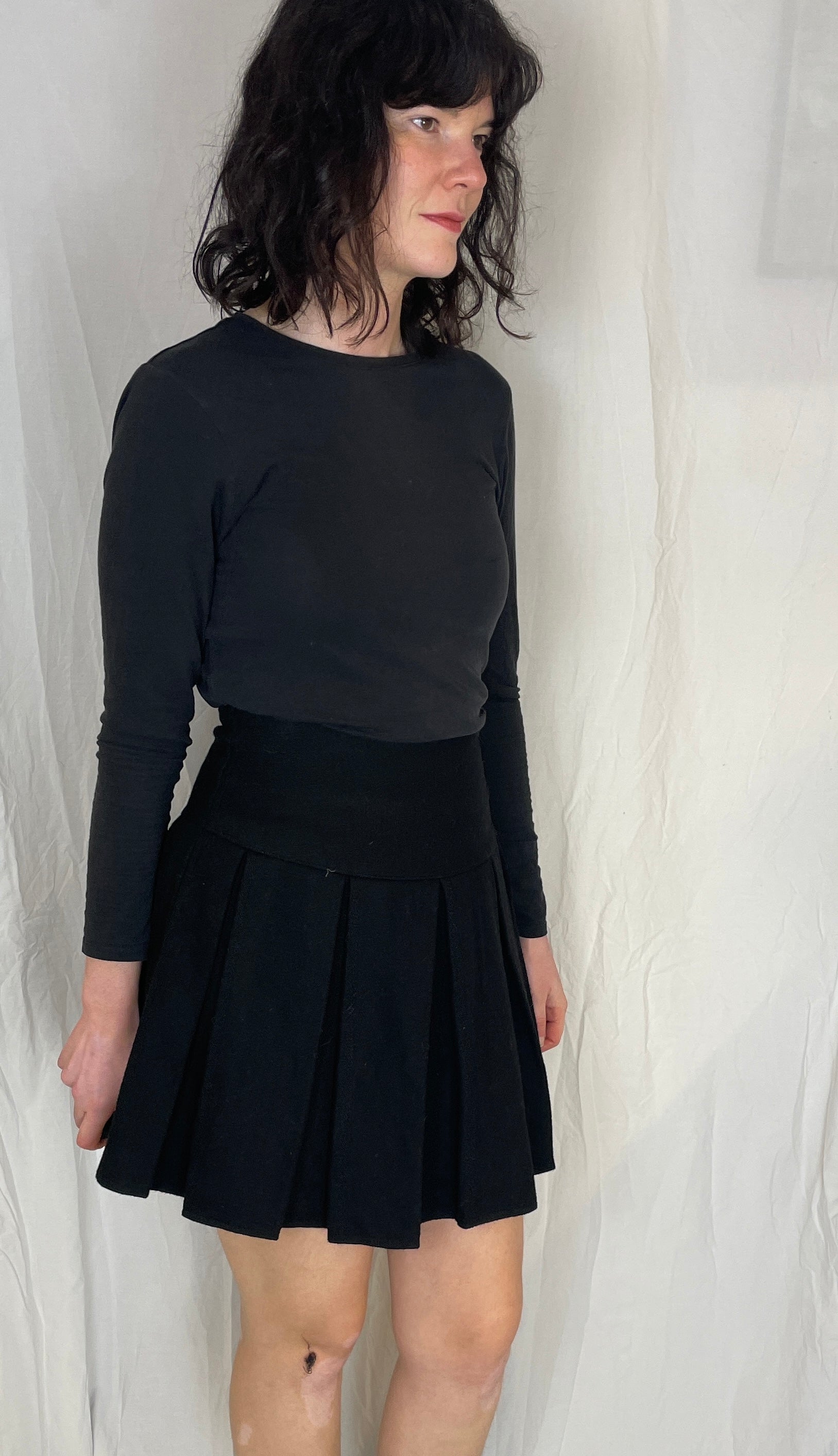 This vintage 90s mini skirt is made from warm black wool fabric with sharp pleats all around. This skirt is high waisted and It is a versatile skirt that works with everything from chunky knits to a shirt. It is a wardrobe staple that works for every occassion.