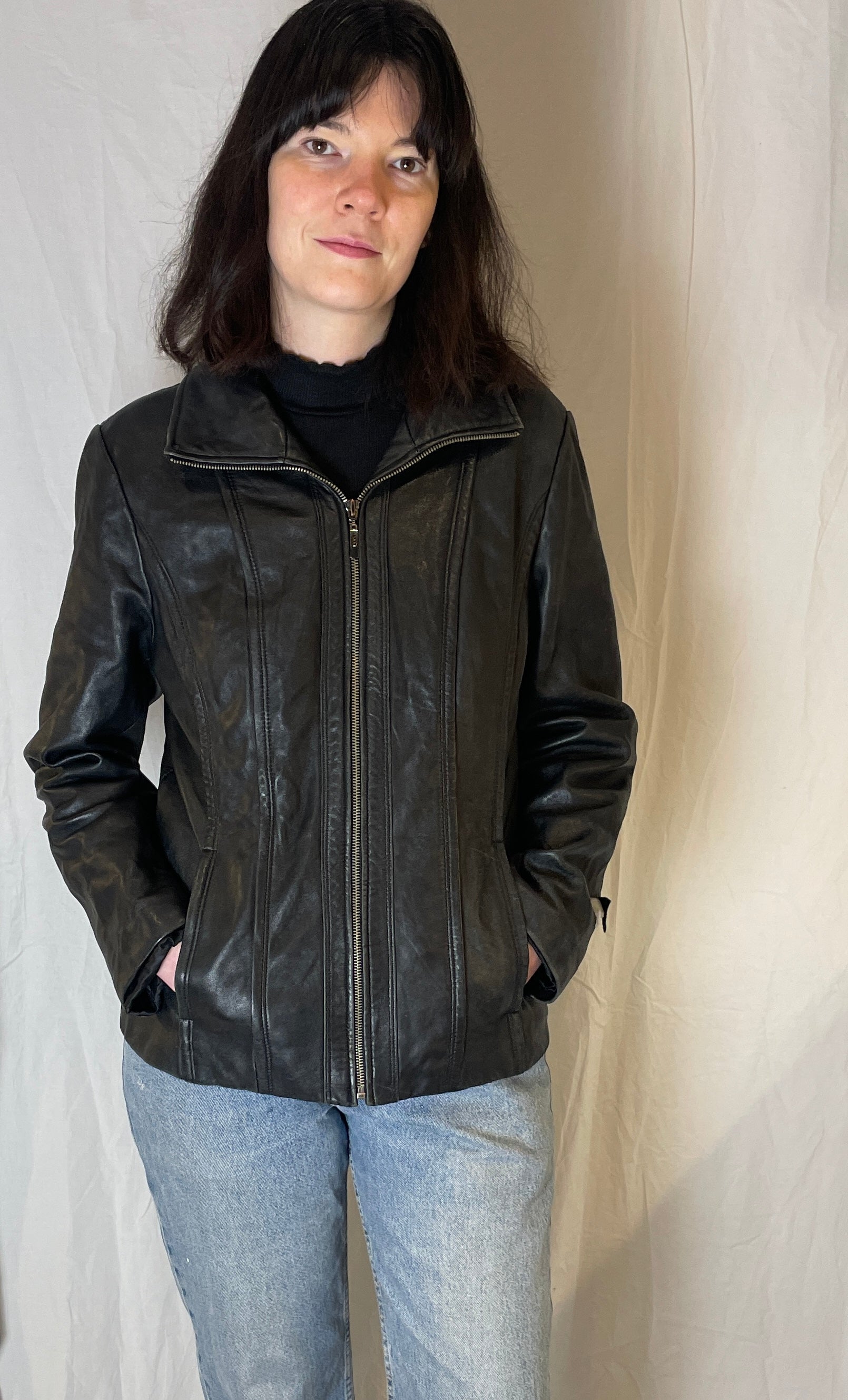 This vintage 90s Kenneth Cole jacket is a classic black colour in smooth leather with panelled details all over. The leather feels soft with a naturally worn vintage finish. It has a zip up front, classic biker style seams and a high neck. Wear this jacket with denim or layered over a simple dress.