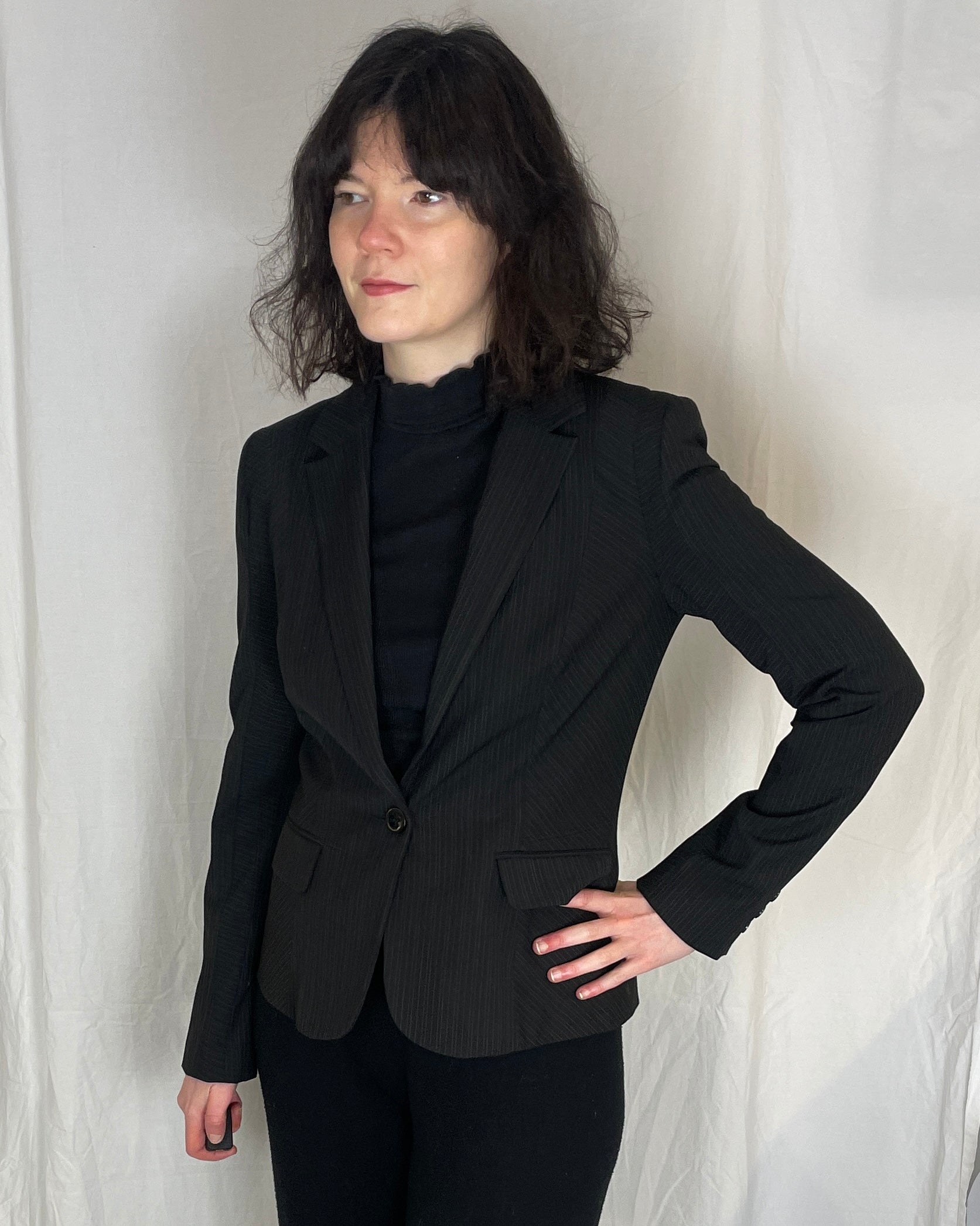 This vintage Y2K blazer is made from black fabric with a pinstriped pattern. It is fitted gives a sharp look. This is a classic blazer which is perfect for the office or other smart outfits. The fabric is slightly stretchy and very comfortable.