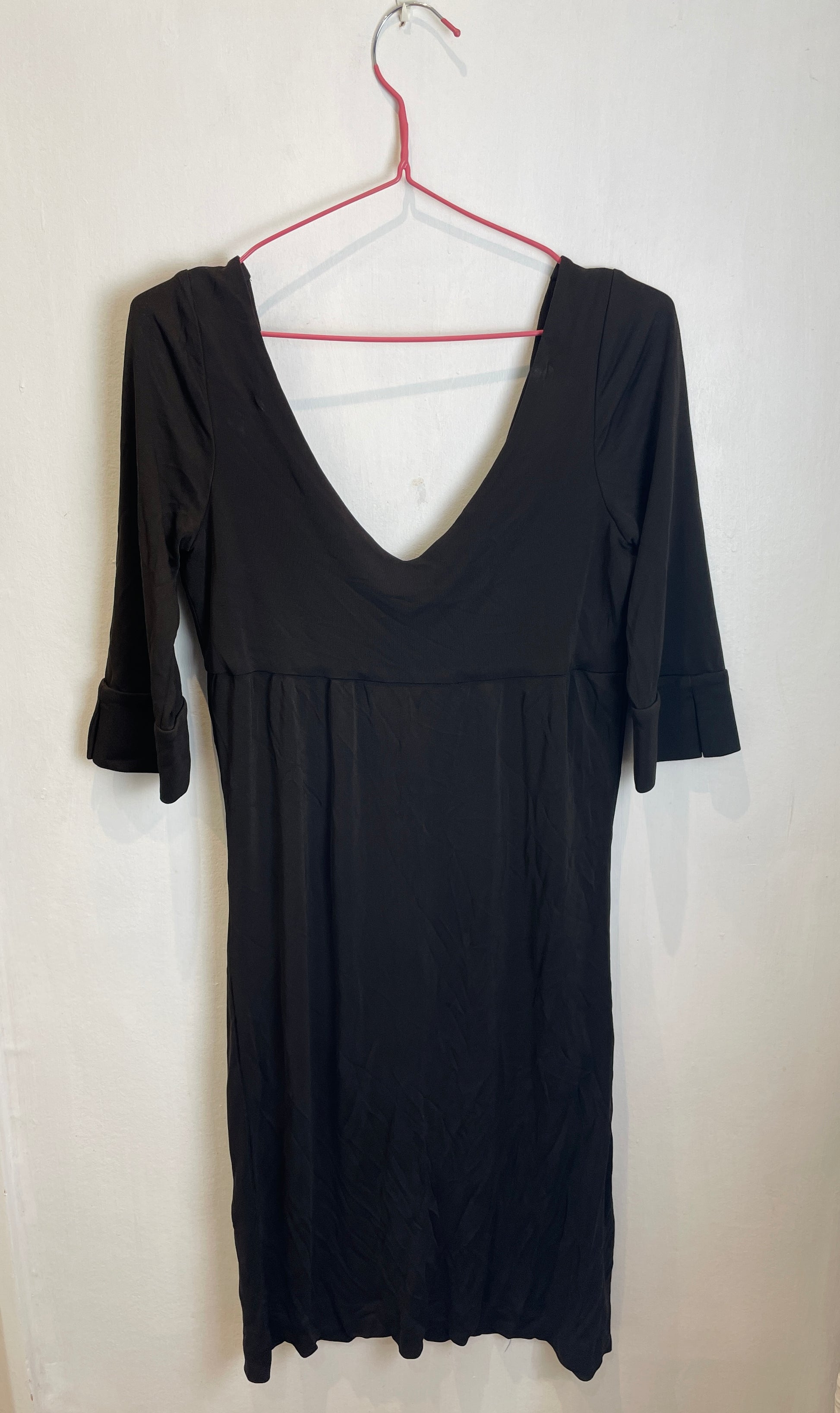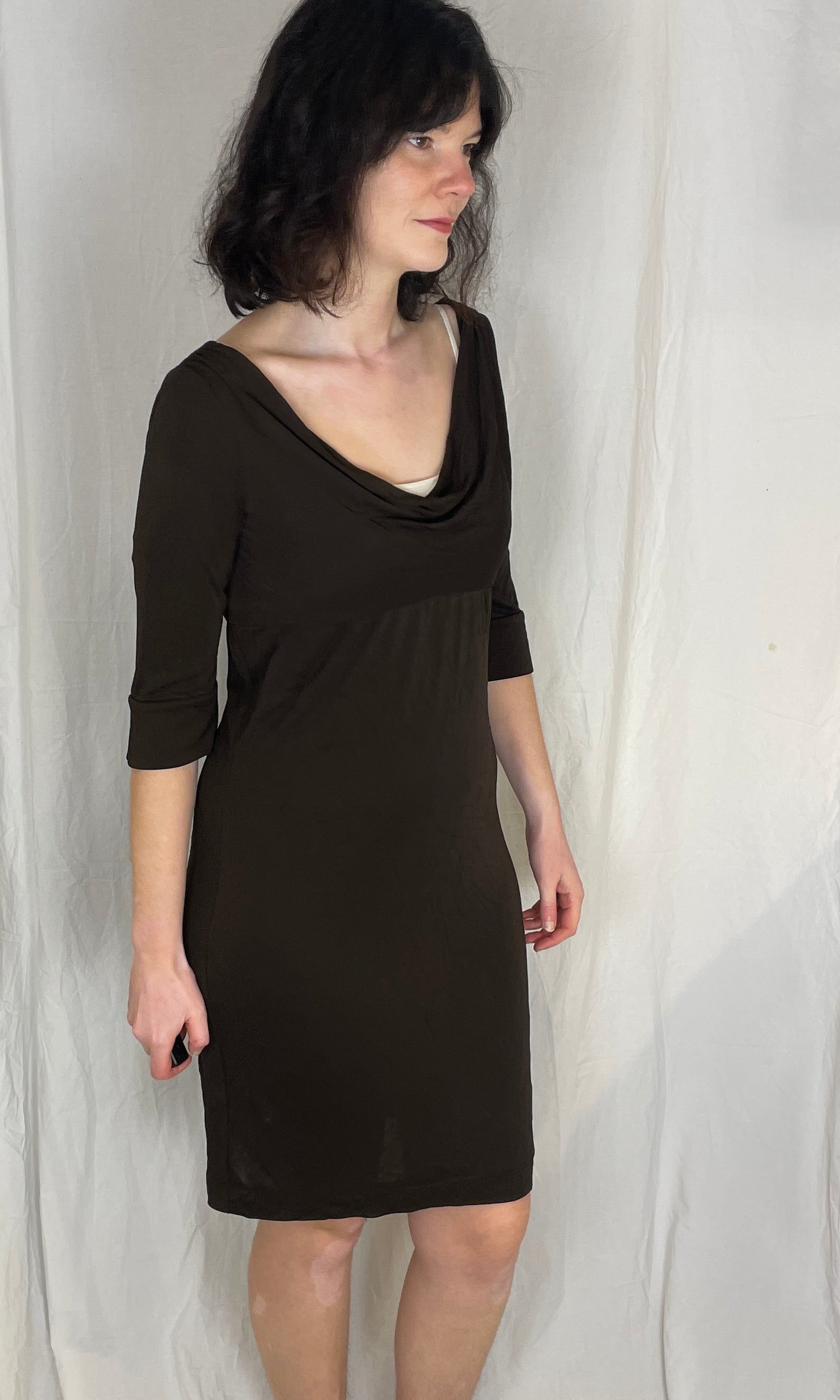 This vintage Y2K Diane Von Furstenberg midi dress is made in a rich brown colour in a soft stretchy fabric. It has a fluid cowl neckline and a cleanshape in a midi length. It is an easy and comfortable dress for both work or evening events.