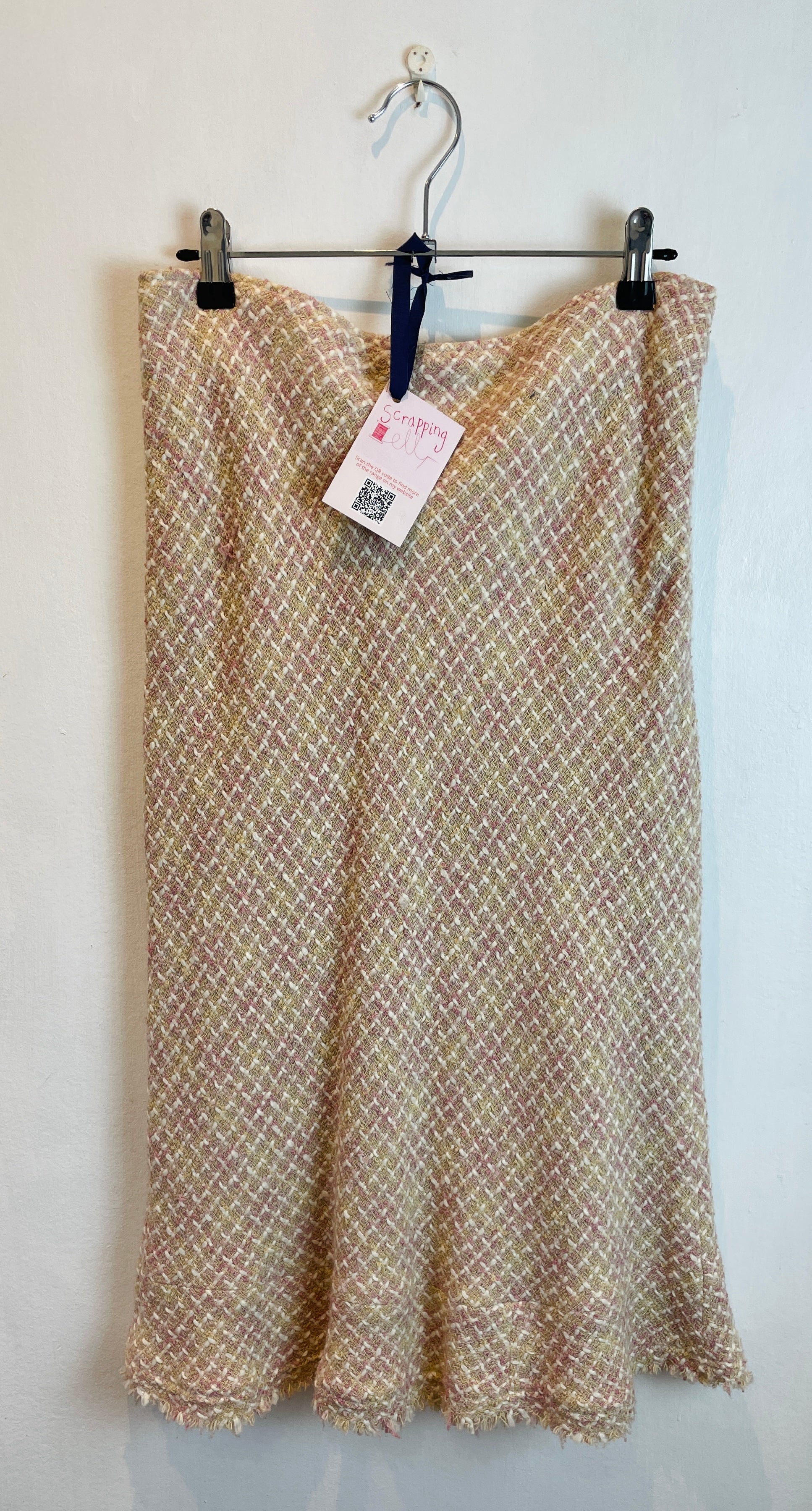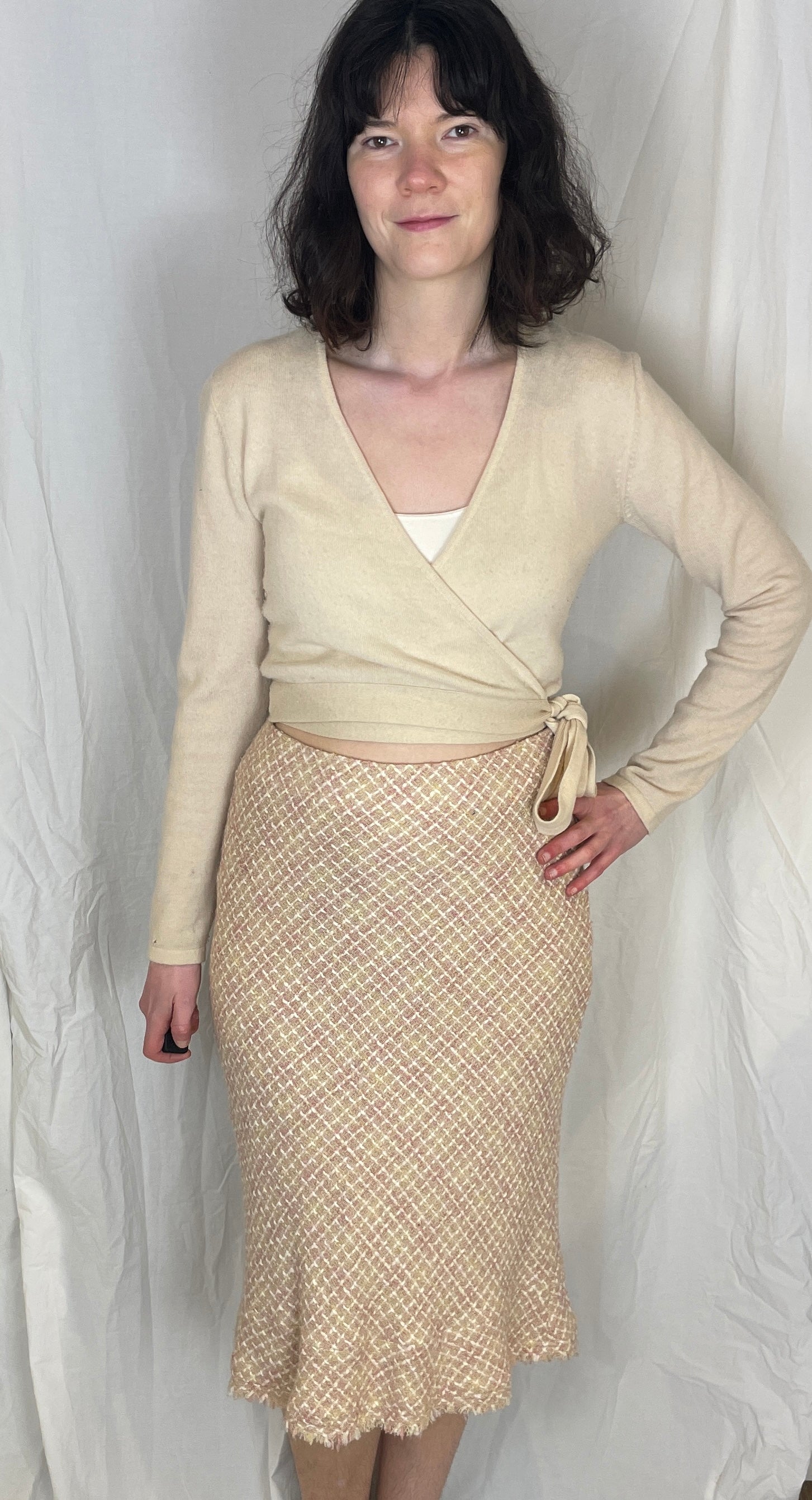 This vintage Y2K midi skirt is made from pale pink wool blend tweed fabric with a textured feel. It has a classic pencil shape in a bias cut for a flattering shape and is a midi length. This skirt is easy to style for smart or everyday outfits.