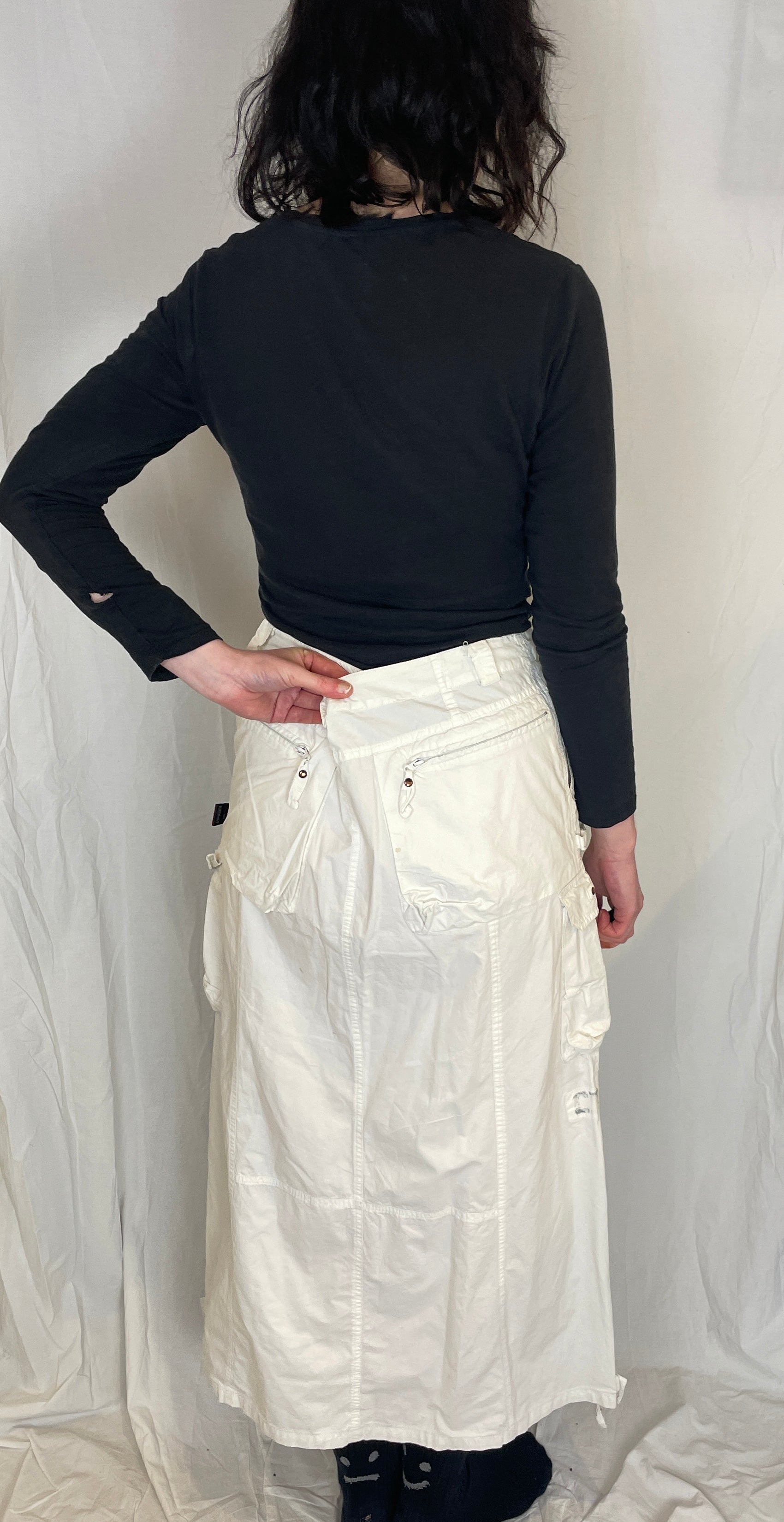 This vintage Y2K maxi skirt is made from lightweight white cotton with a classic cargo look. It has multiple zip and flap pockets, giving it that utility look. This skirt has a mid rise waistband and a clean straight silhouette and is perfect for everyday styling.