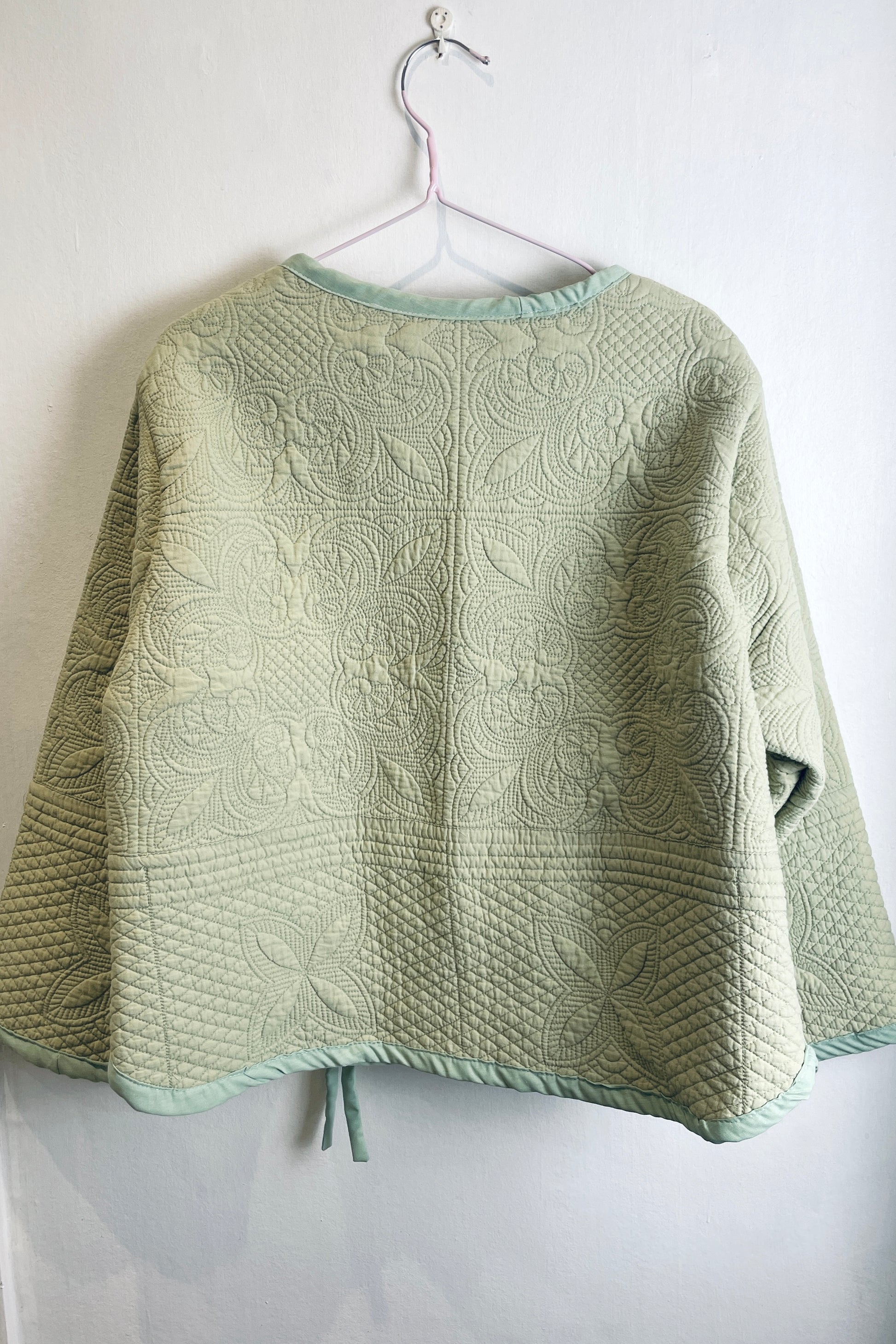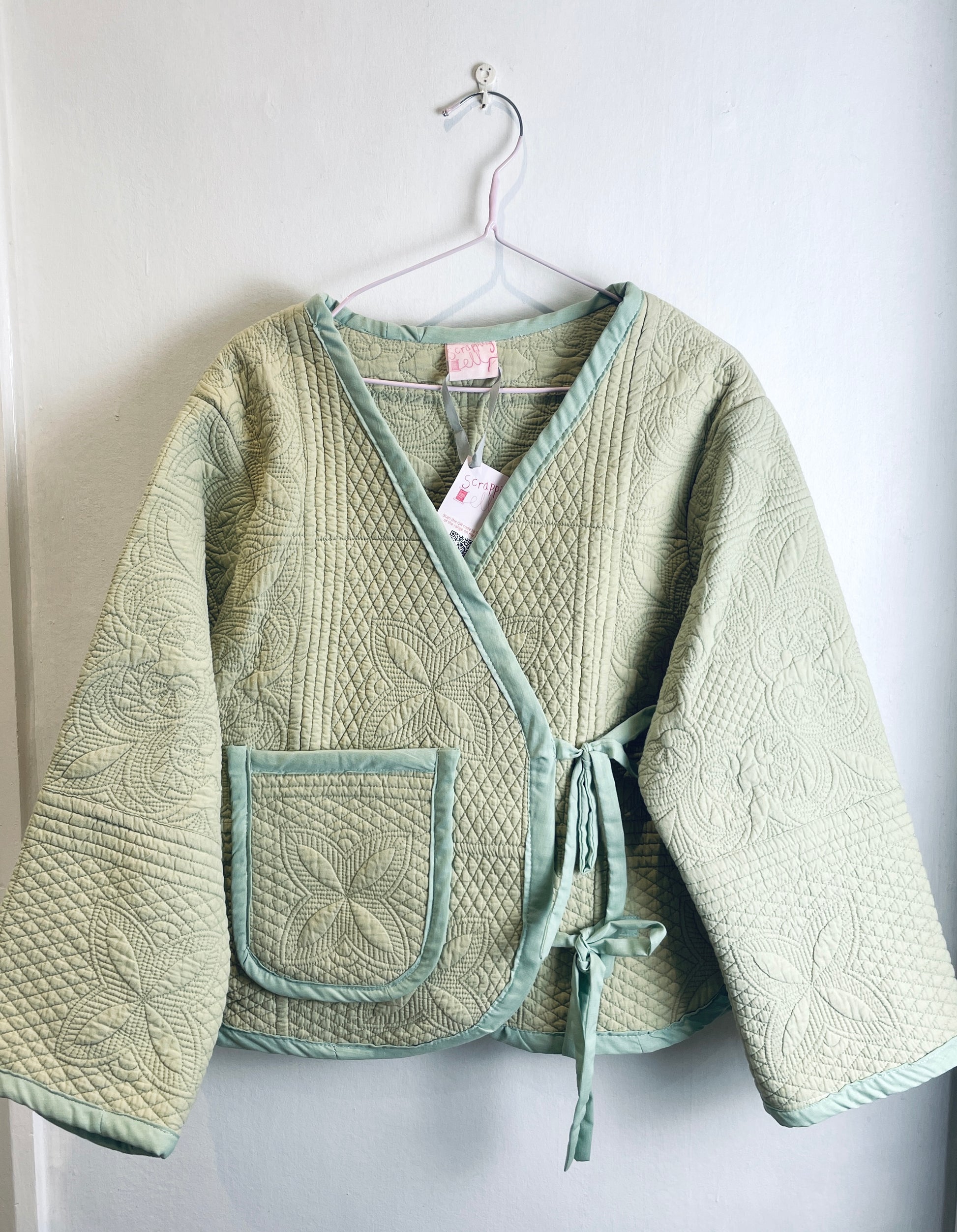 This handmade quilted jacket is made from a sage green floral textured, quilted fabric with a beautiful raised surface. It is lightly padded for warmth and structure and it features a wrap front design that ties at the waist. It is finished with bound edges and is a unique piece that will add texture to your outfit.