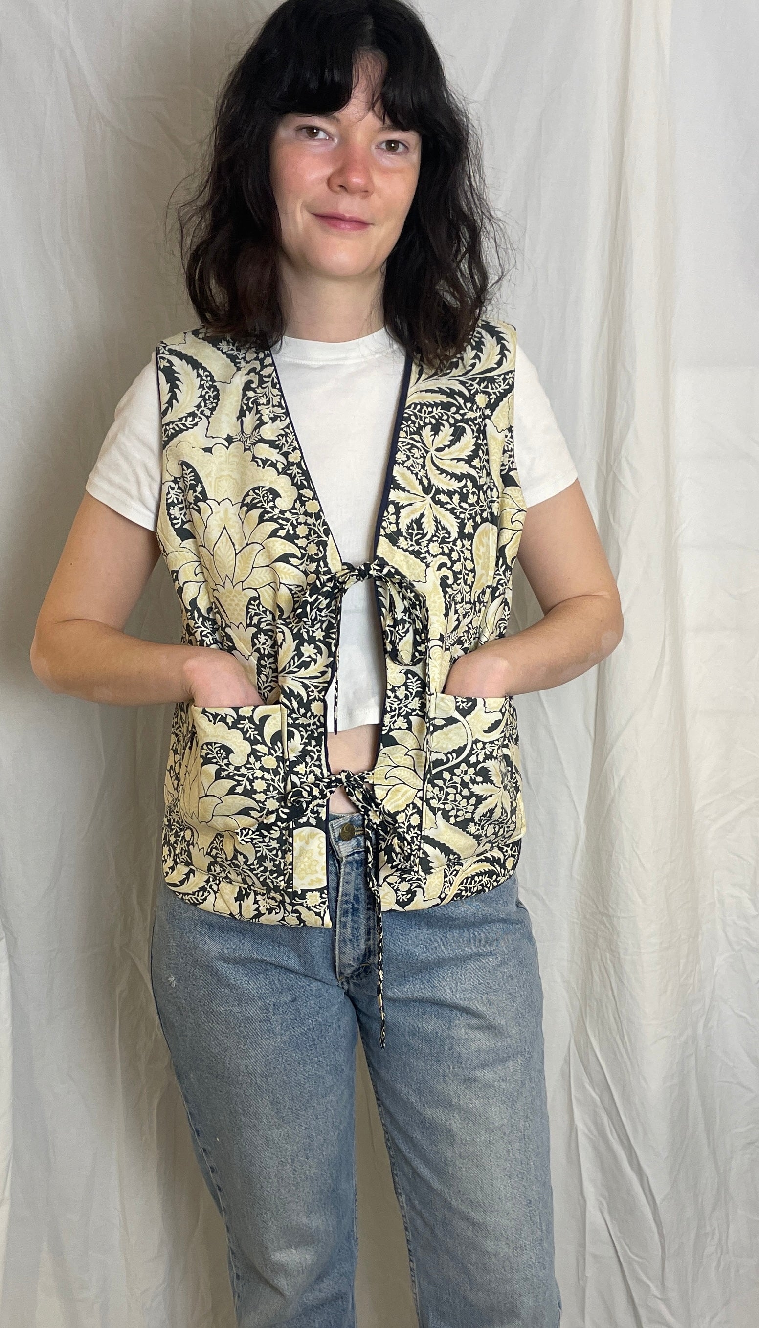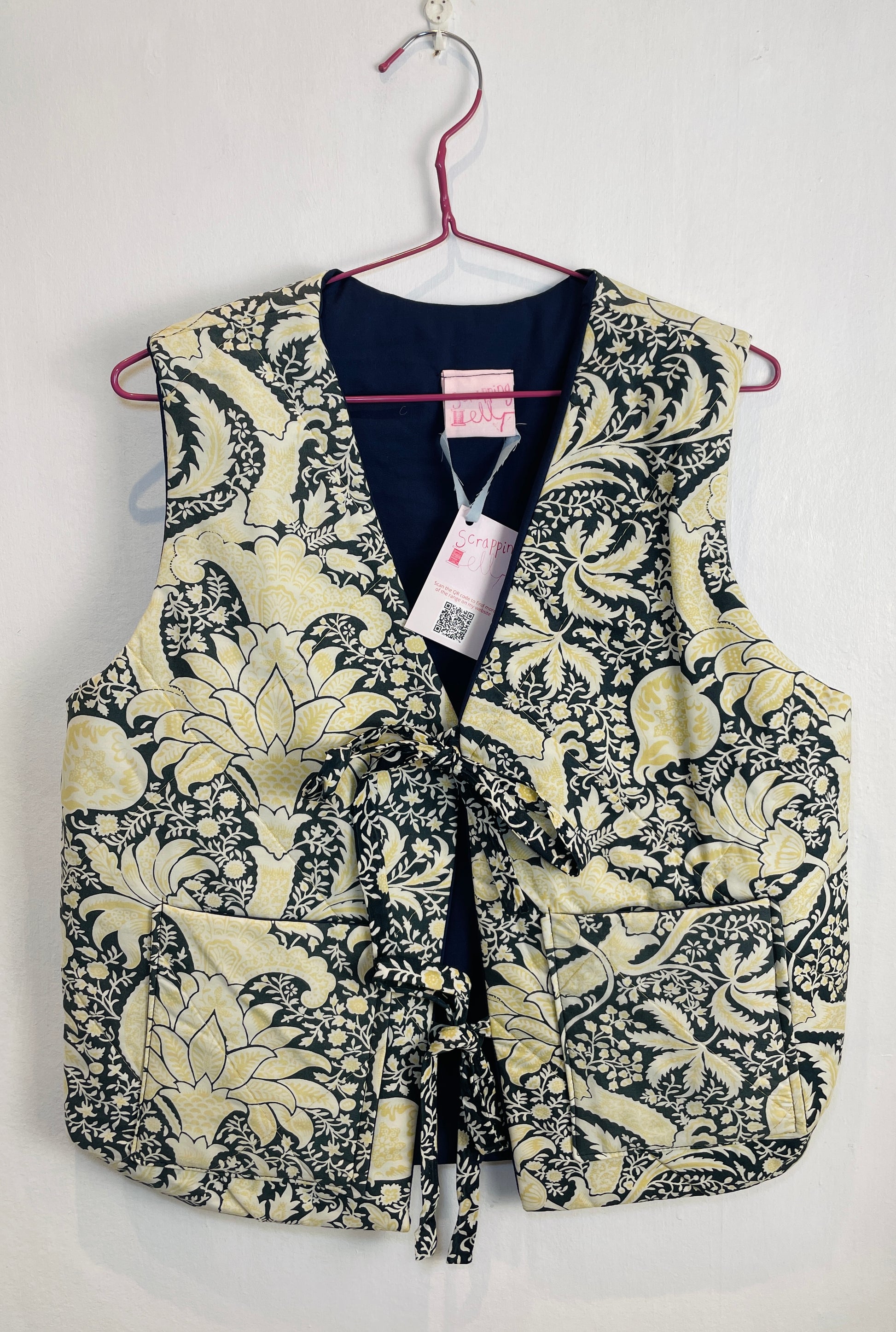 This handmade gilet is a navy blue colour in a quilted fabric with a yellow William Morris style floral print all over. The fabric is lightly padded and comfy to wear. It is a sleeveless design for layering, has a tie front fastening and a boxy, relaxed fit.